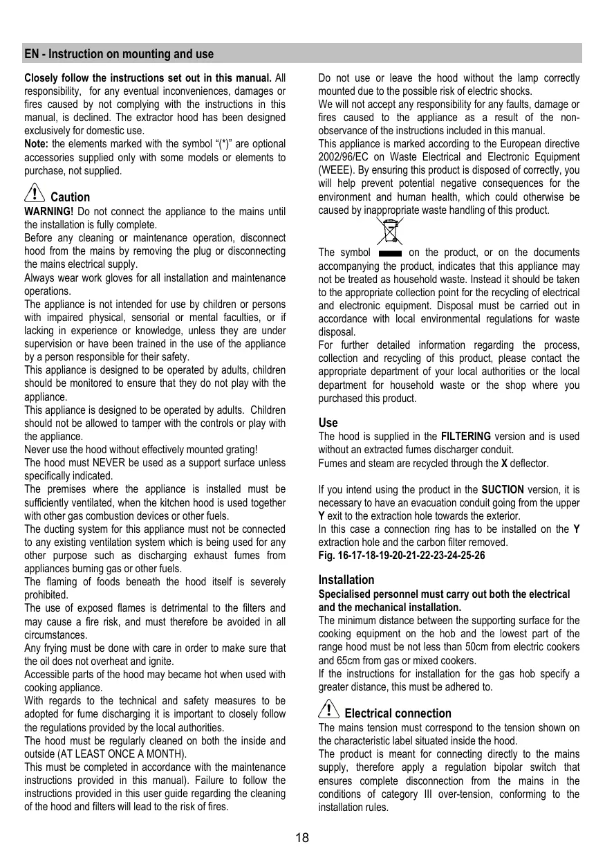 En ce qui concerne les mesures techniques et de sécurité à adopter pour l'évacuation des fumées, s'en tenir strictement à ce qui est prévu dans les règlements des autorités locales compétentes. La hotte doit être régulièrement netoyée, aussi bien à l'intérieur qu'à l'extérieur (AU MOINS UNE FOIS PAR MOIS, respecter néanmoins les instructions relatives à l'entretien fournies dans ce manuel)