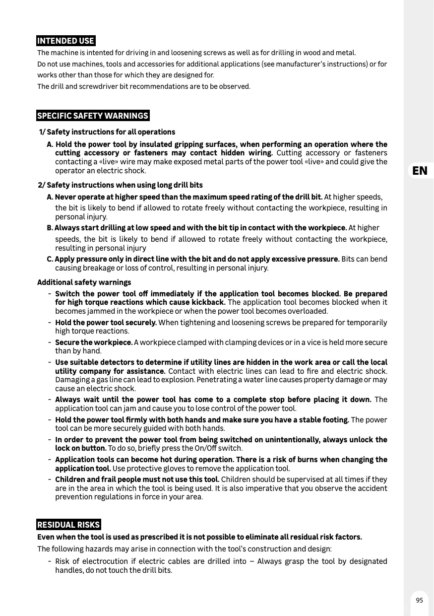 RESIDUAL RISKS Even when the toolis used as prescribed it is not possible to eliminate allresidual risk factors. The following hazards may arise in connection with the tools construction and design: