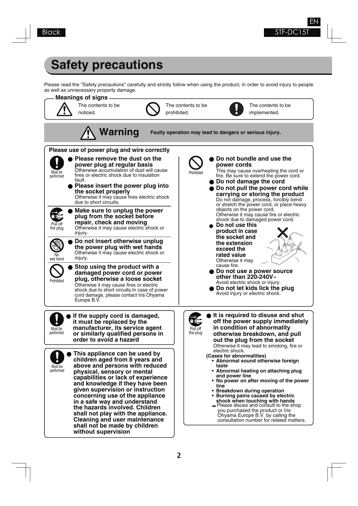 Stop using Turn off the power immediately and unplug the power cord from the socket. Please consult the store at the time of purchase or Iris Ohyama Europe B.V.