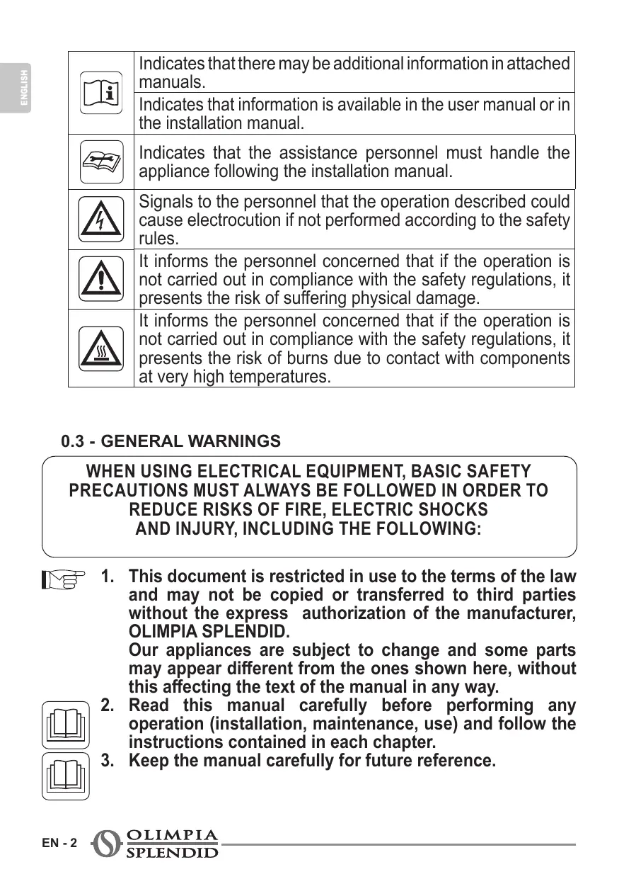 This document is restricted in use to the terms of the law and may not be copied or transferred to third parties without the express authorization of the manufacturer, OLIMPIA SPLENDID.