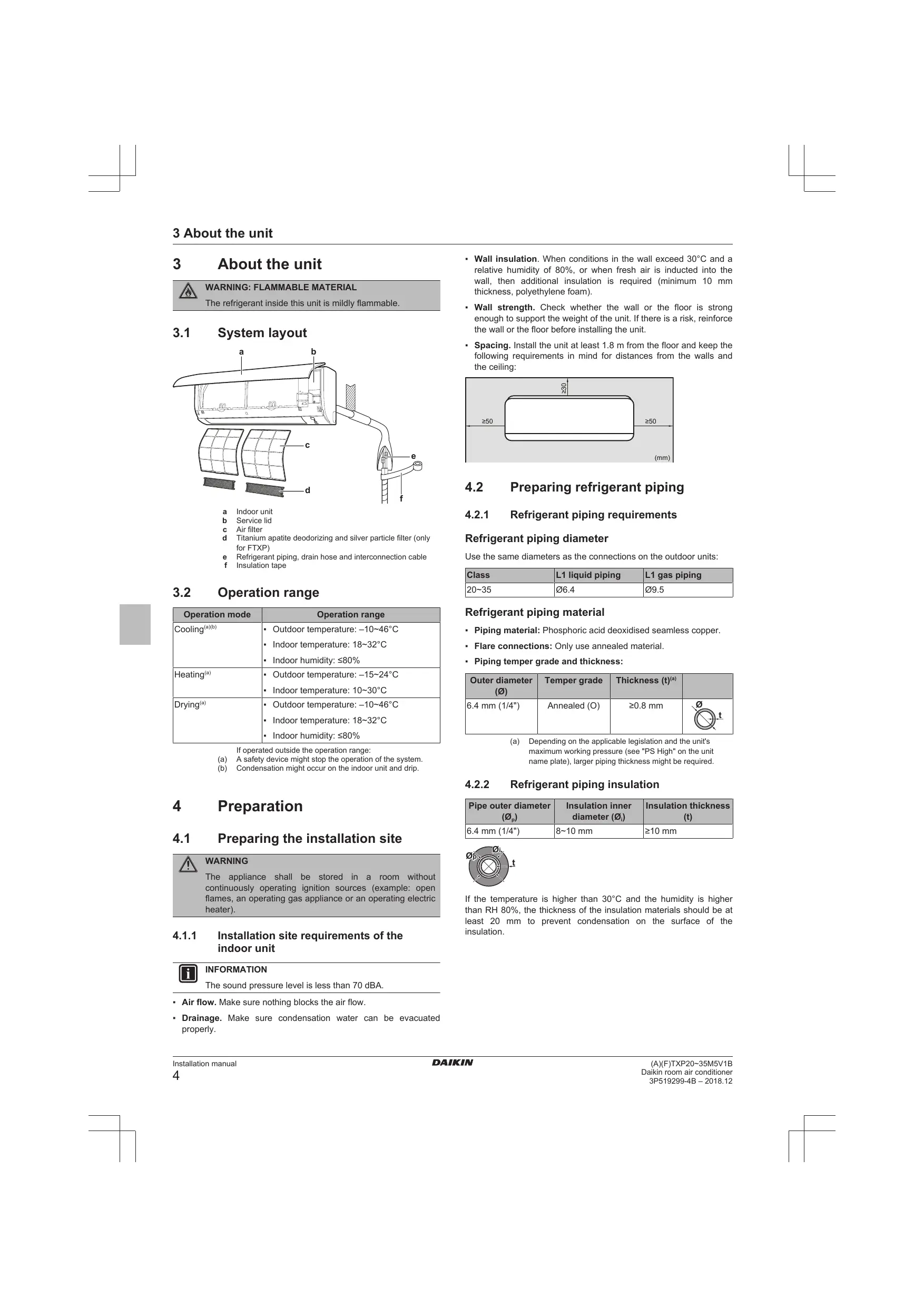 Coolingi® + Outdoor temperature: -10-46°C + Piping material: Phosphoric acid deoxidised seamless copper. F_ Indoor temperature: 18-32°C + Flare connections: Only use annealed material. Indoor humidity: 80% + Piping temper grade and thickness: