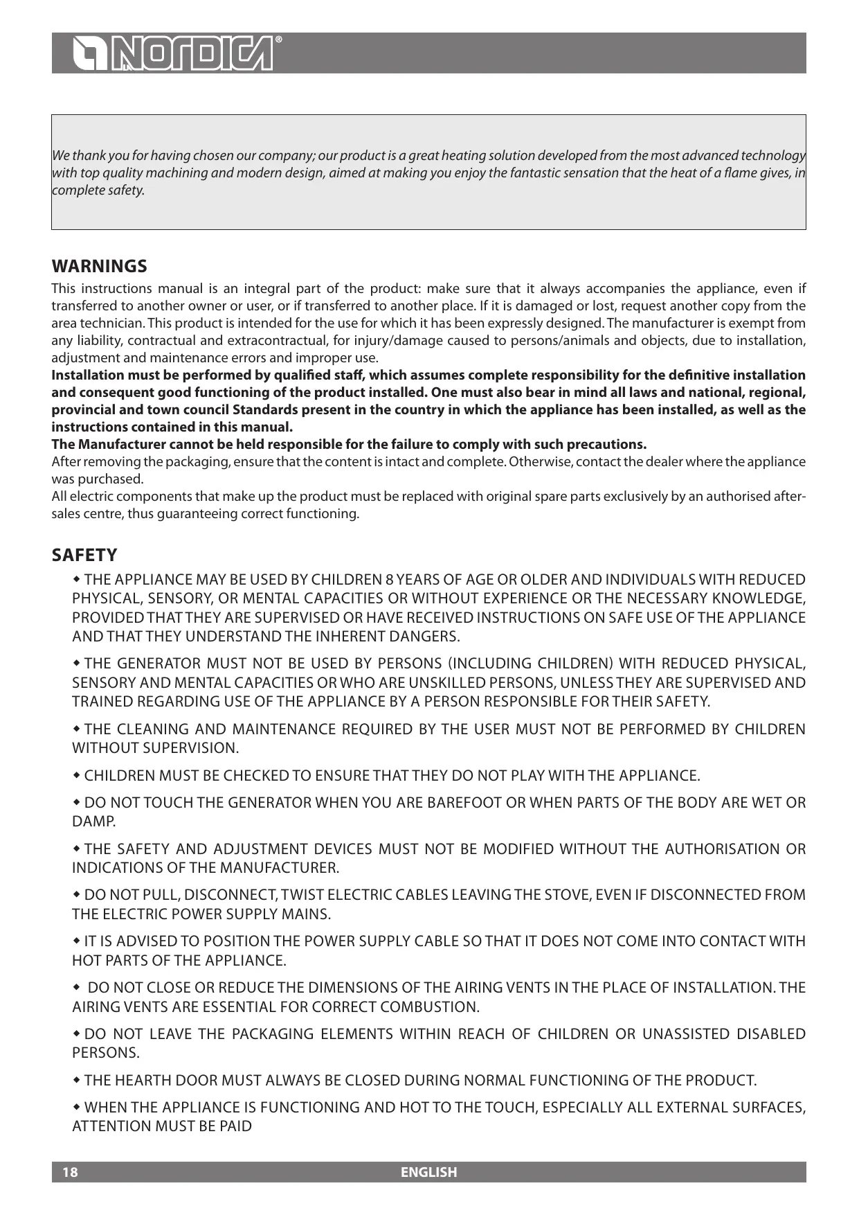AVERTISSEMENTS GENERAUX La responsabilité de La société La NORDICA S.p.a. se limite à la fourniture de l'appareil.