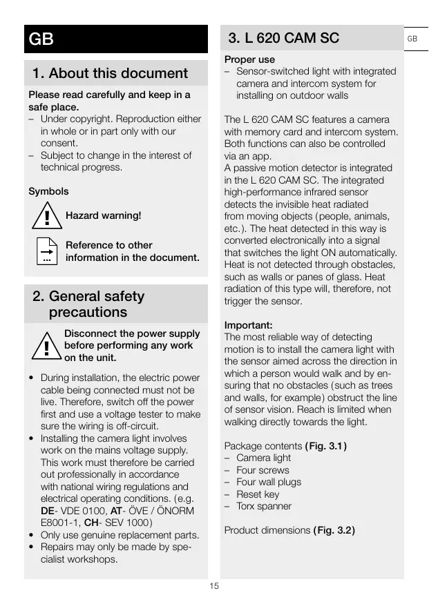 Avant toute intervention sur L'installation de l'applique avec caméra implique une intervention sur le réseau électrique et doit donc être effectuée correctement et conformément à la nomme NF C-15100. (Par ex. DE - VDE 0100, AT - ÔVE / NORM E8001-1, CH - SEV 1000) Utiser uniquement des pièces de: rechange d'origine. Les réparations ne doivent être effec- tuées que par des ateliers spécialisés.