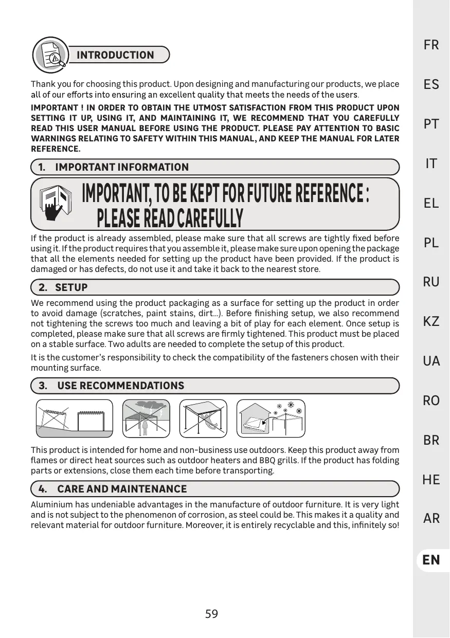 This product is intended for home and non-business use outdoors. Keep this product away from flames or direct heat sources such as outdoor heaters and BBQ grills. Ifthe product has folding parts or extensions, close them each time before transporting.
