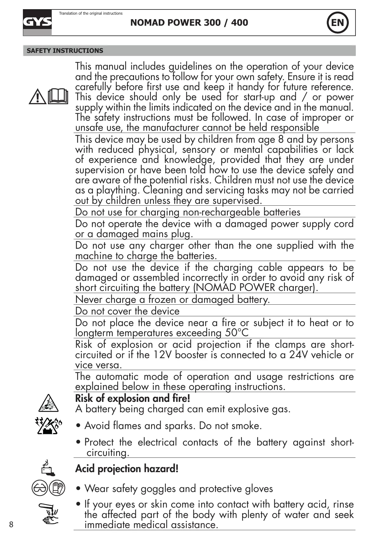 Download the instructions for your Booster lithium in PDF format for free! Find your manual NOMAD POWER 400 - 300 - GYS and take your electronic device back in hand. On this page are published all the documents necessary for the use of your device. NOMAD POWER 400 - 300 by GYS.