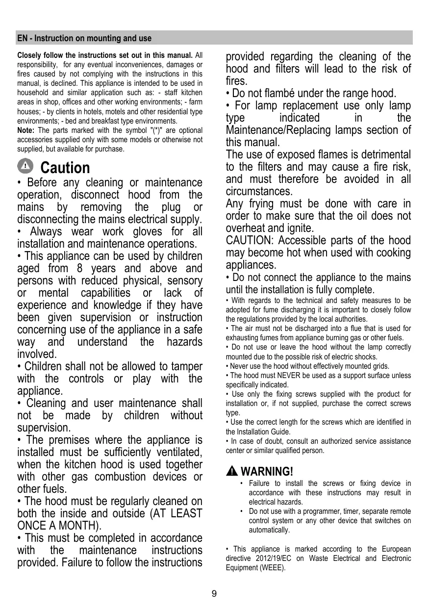 + Ne pas utiliser ou laisser la hotte sans les lampes correctement montées, car un éventuel risque de choc