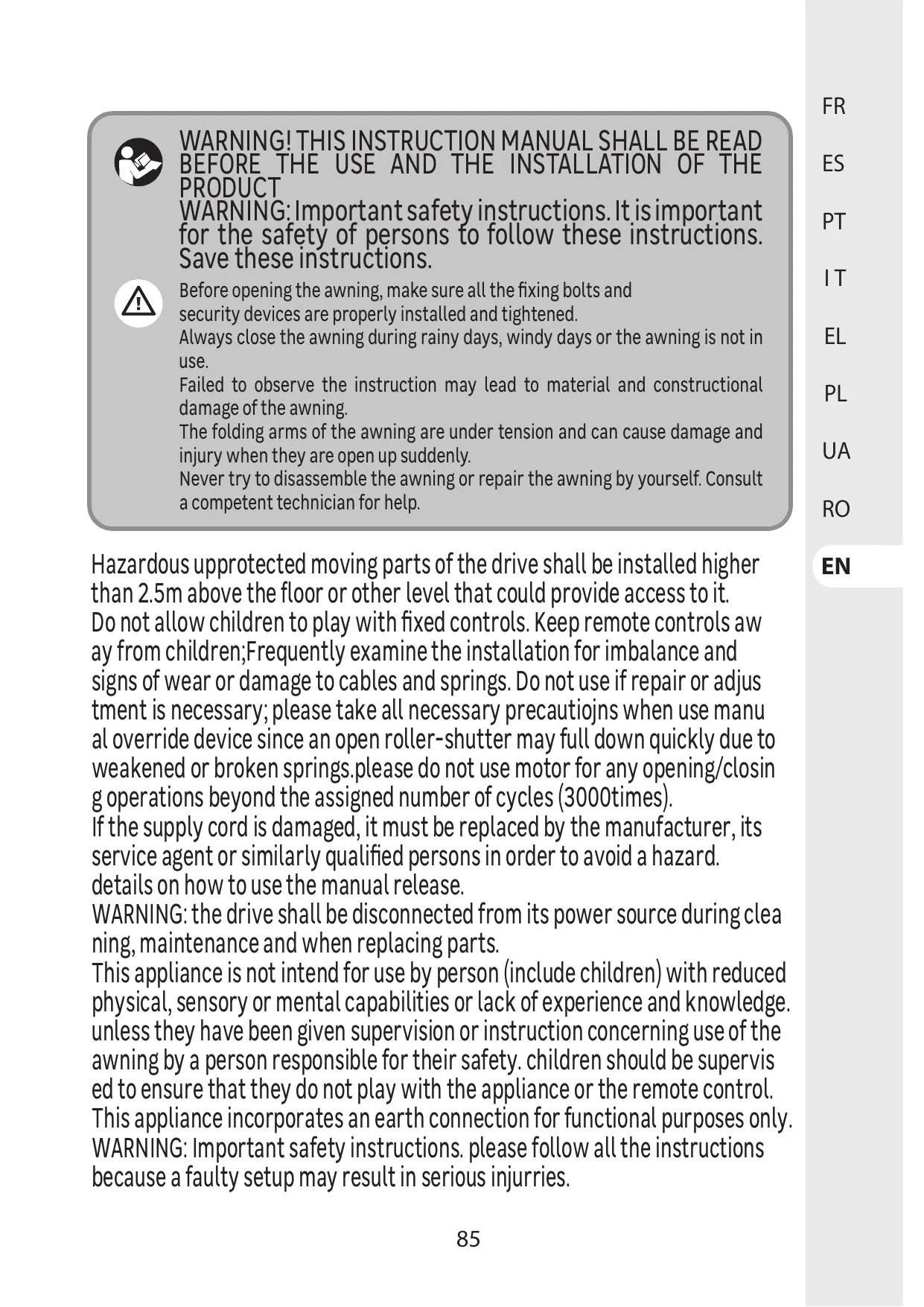 éléments de sécurité ont été installés de façon correcte. Vous devez toujours fermer votre store banne quand Le vent souffle, durant une averse et quand vous n’en avez pas l'usage. Ne pas respecter ces consignes pourrait provoquer des dommages matériels et structurels. Les bras du store banne sont tendus et peuvent provoquer en cas d'ouverture brutale, des blessures et des dommages. Ne jamais essayer de démonter ou de réparer vous-même ce store banne.
