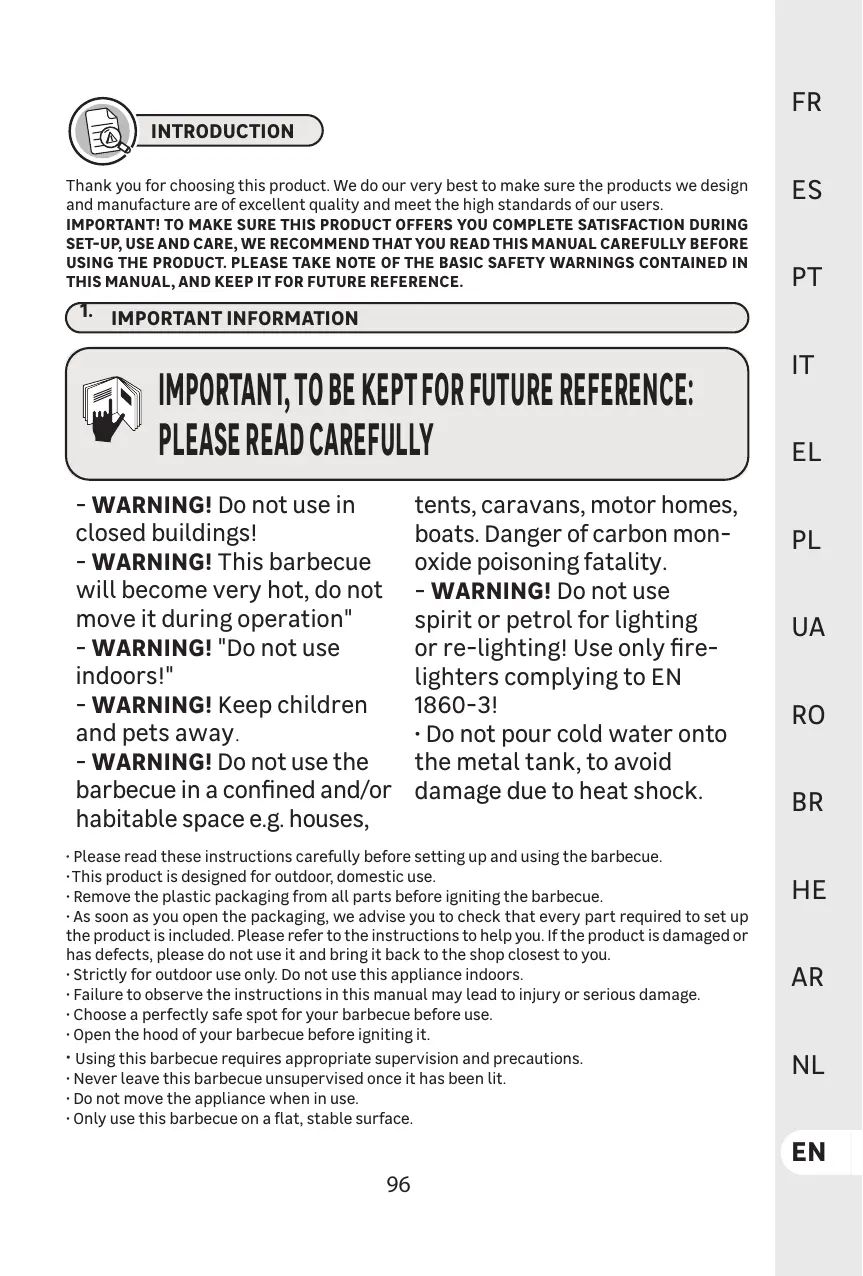 - ATTENTION ! Ne pas utiliser le barbecue dans un espace confiné et/ou habitable par exemple des maisons, tentes,