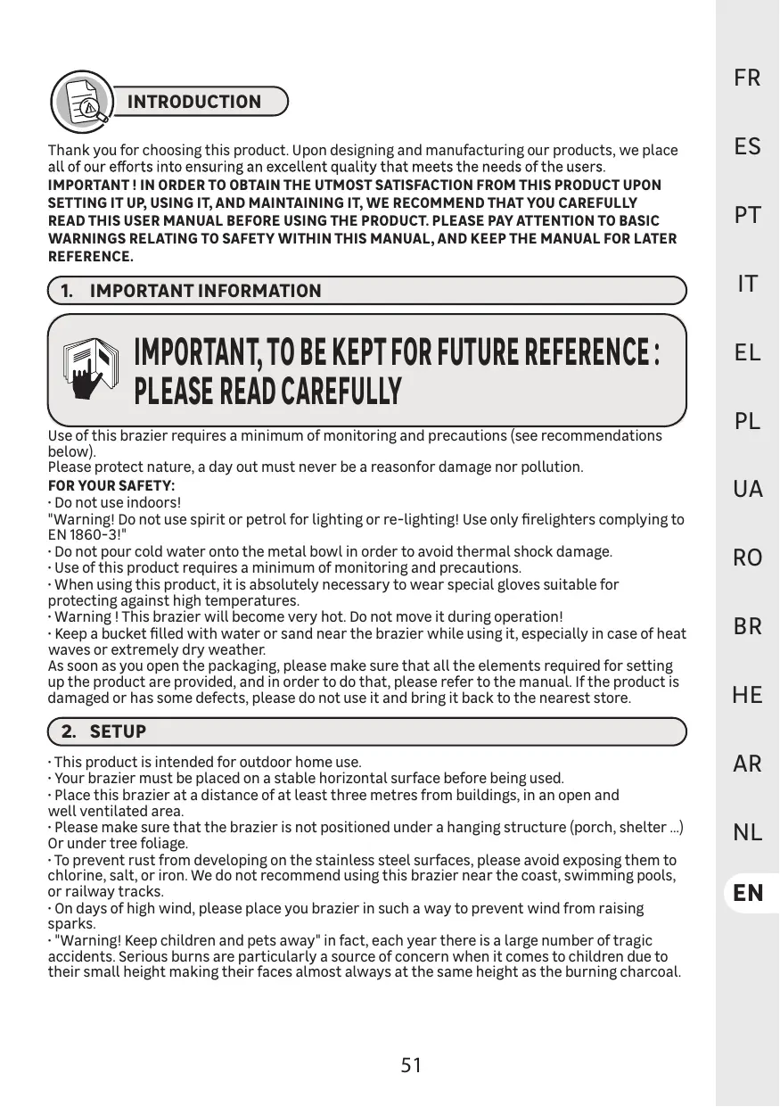 Pour votre sécuri * ATTENTION! Ce brasero n'est pas un barbecue, il est fortement interdit de l'utiliser comme moyen de cuisson.