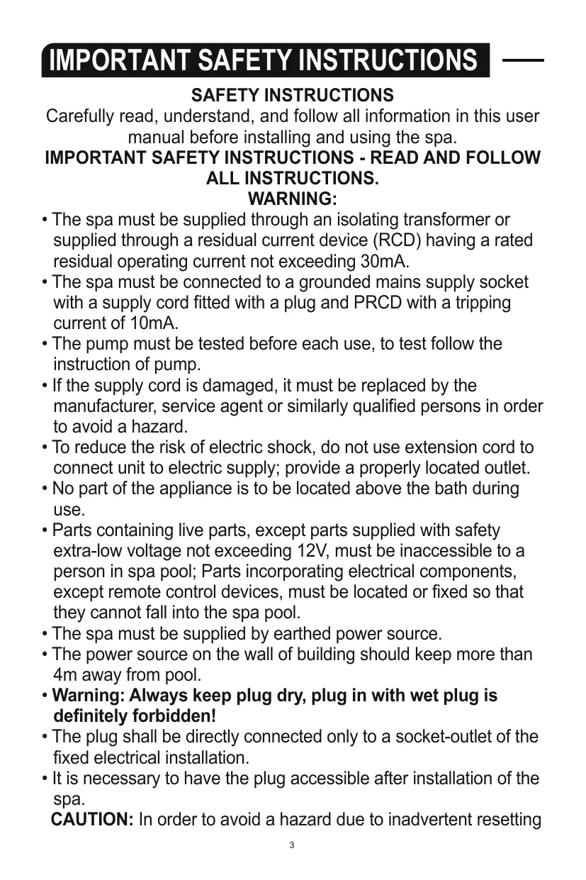 PRCD est intégré dans le cordon d'alimentation ; en cas de détection d'un courant de fuite supérieur à 10 mA, l'appareil fonctionnera et coupera l'alimentation électrique. Dans un tel cas, veuillez immédiatement débrancher le spa et arrêter de l'utiliser. Ne réinitialisez pas le produit vous-même. Vous devez contacter votre représentant local pour contrôler et réparer le produit.