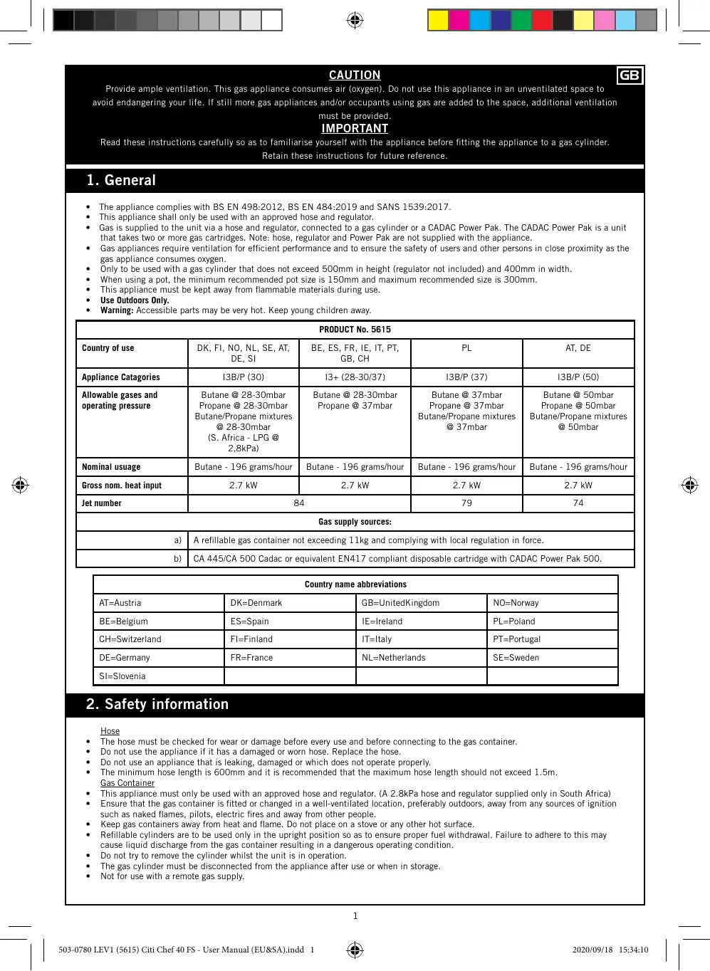 + Lors de l'utilisation d'une casserole, sa taille doit être comprise entre 150 mm el 300 mm + Get appareil doit être tenu éloigné de toute matière inflammable durant son utilisation + À utiliser exclusivement en extérieur. + _Httention: les parties accessibles peuvent âtre extrêmement chaudes. Tenir les jeunes enfants à l'écart PRODUCT No. 5615 Pays d'utilisation DK, FI, NO, NL, SE, AT, BE, ES, FR, IE, IT, PT, PL AT, DE DE, Si GE, ch Abréviations des noms de pays HT=Autriche DK=Danemark GB-Royaume-Uni NO=Norvége BE-Belgique ES=Espagne IEzirelande PL=Pologne N'utilisez pas un appareil qui fuit, qui est endommagé ou qui ne fonctionne pas correctement.