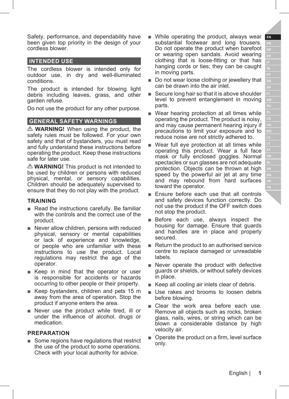 = Ne modifiez la machine d'aucune façon et n'utilisez pas de pièces ni d'accessoires non recommandés par le fabricant. À AVERTISSEMENT! Si le produit est tombé, a subi un choc important ou se met à vibrer de façon anormale, arrêtez-le immédiatement et recherchez les dommages éventuels ou identifiez la cause des vibrations. Toute pièce endommagée doit être correctement remplacée ou réparée par un centre de service agréé = Pourréduirele risque de blessure associées à l'entrée en contact avec les éléments en rotation, il convient de toujours arrêter le produit, de retirer le bloc de batterie, et de s'assurer que tous les éléments en mouvement se sont bien arrêtés: e avant de nettoyer ou de dégager la cause d'un blocage e lorsque vous laissez le produit sans surveillance
