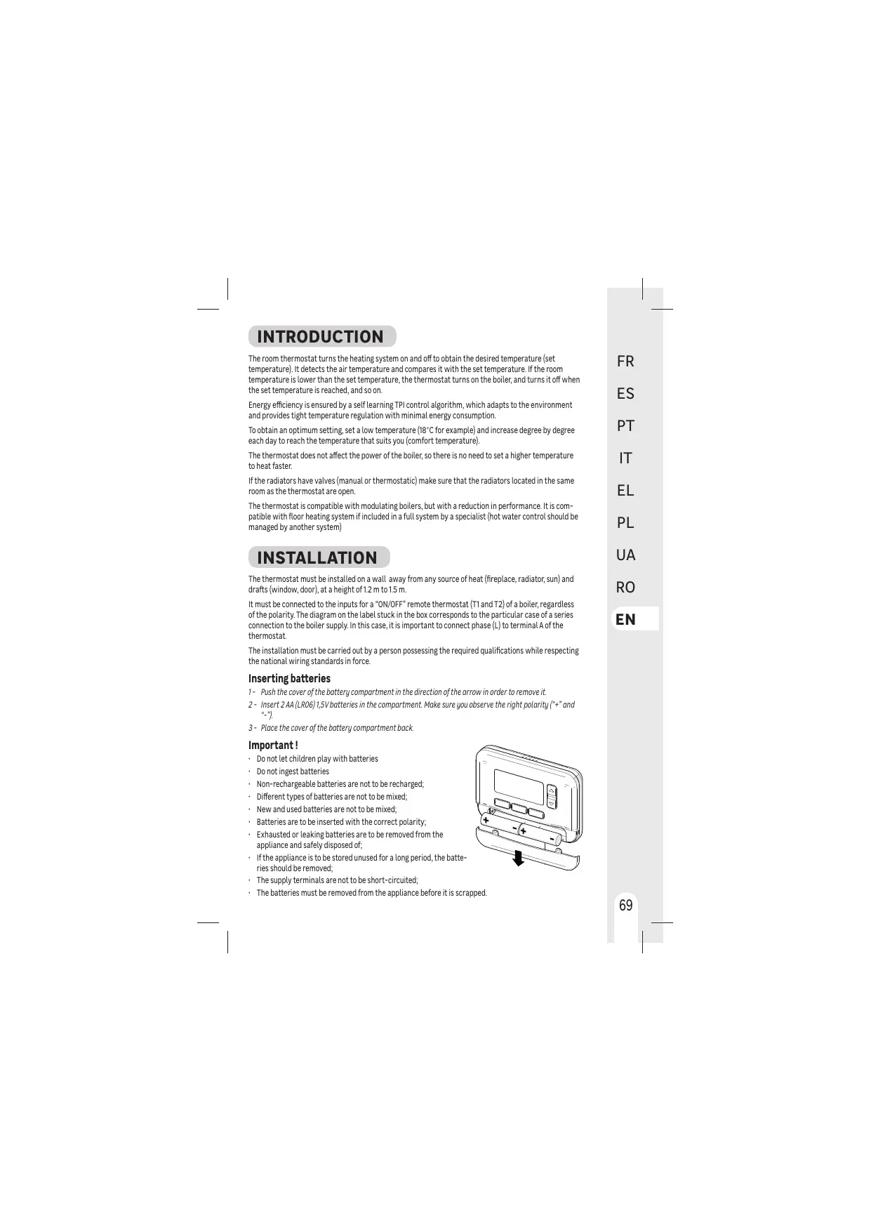 INSTALLATION Le thermostat dot étre installé surun mur ou une cloison, éloigné de toute source de chaleur radiateur cheminée soleil et des courants d'air fenêtre, porte, une hauteur de ,2m à 15m