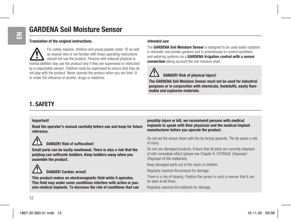 Download the instructions for your Capteur d'humidité in PDF format for free! Find your manual 1867 - GARDENA and take your electronic device back in hand. On this page are published all the documents necessary for the use of your device. 1867 by GARDENA.