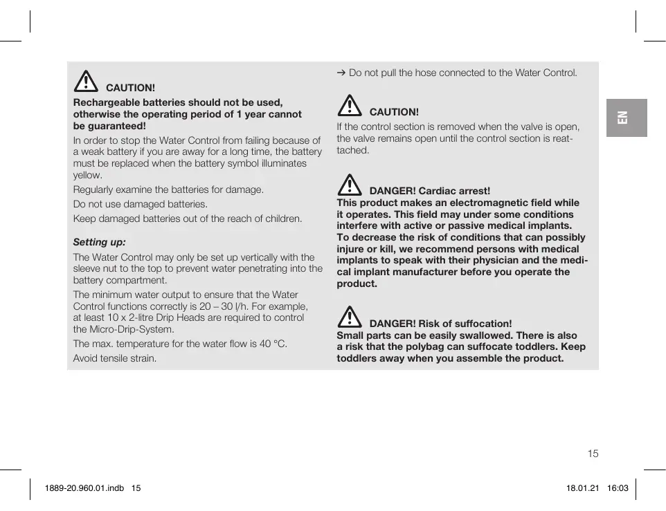 Download the instructions for your Programmateur d'arrosage in PDF format for free! Find your manual 1889 - GARDENA and take your electronic device back in hand. On this page are published all the documents necessary for the use of your device. 1889 by GARDENA.