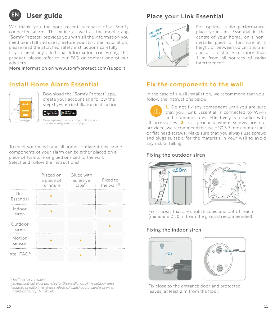 Posé sur n Fixé Collé n un meuble au mur Link . Essential Sirène . . intérieure Dans le cas d'une installation murale, nous vous recommandons de suivre les instructions suivantes.