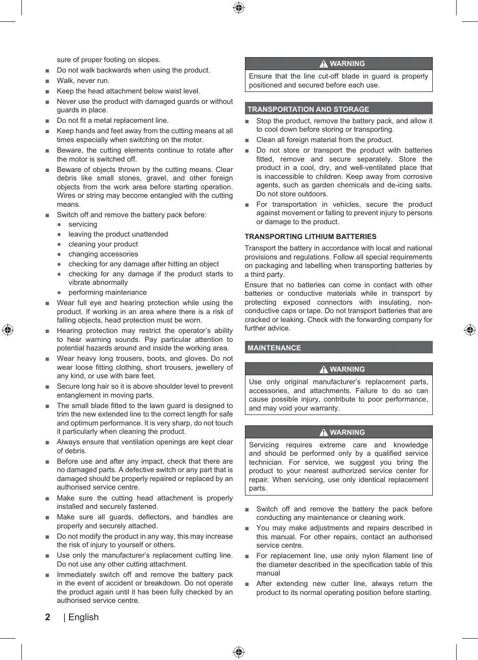 Lorsqu'il est équipé d'une tête de coupe-gazon (et des protections appropriées), le produit est conçu pour couper les herbes hautes, les mauvaises herbes épaisses et les végétaux similaires au niveau du sol, où à proximité. Le plan de coupe doit être approximativement parallèle à la surface du sol lors du débroussaillage et approximativement vertical lors de la coupe de bordure.