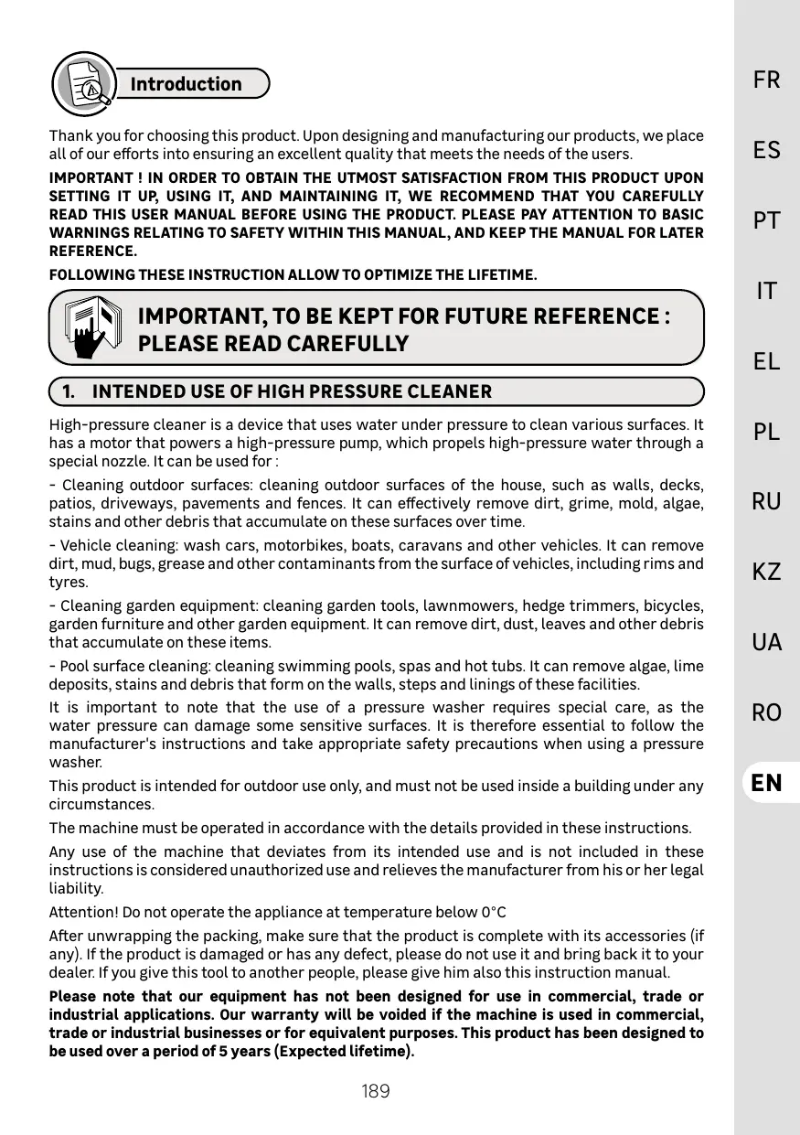 FN IMPORTANT - À CONSERVER POUR TOUTE REFERENCE ULTÉRIEURE : VEUILLEZ LIRE ATTENTIVEMENT Qi. UTILISATION PRÉVUE DU NETTOYEUR HAUTE PRESSION )
