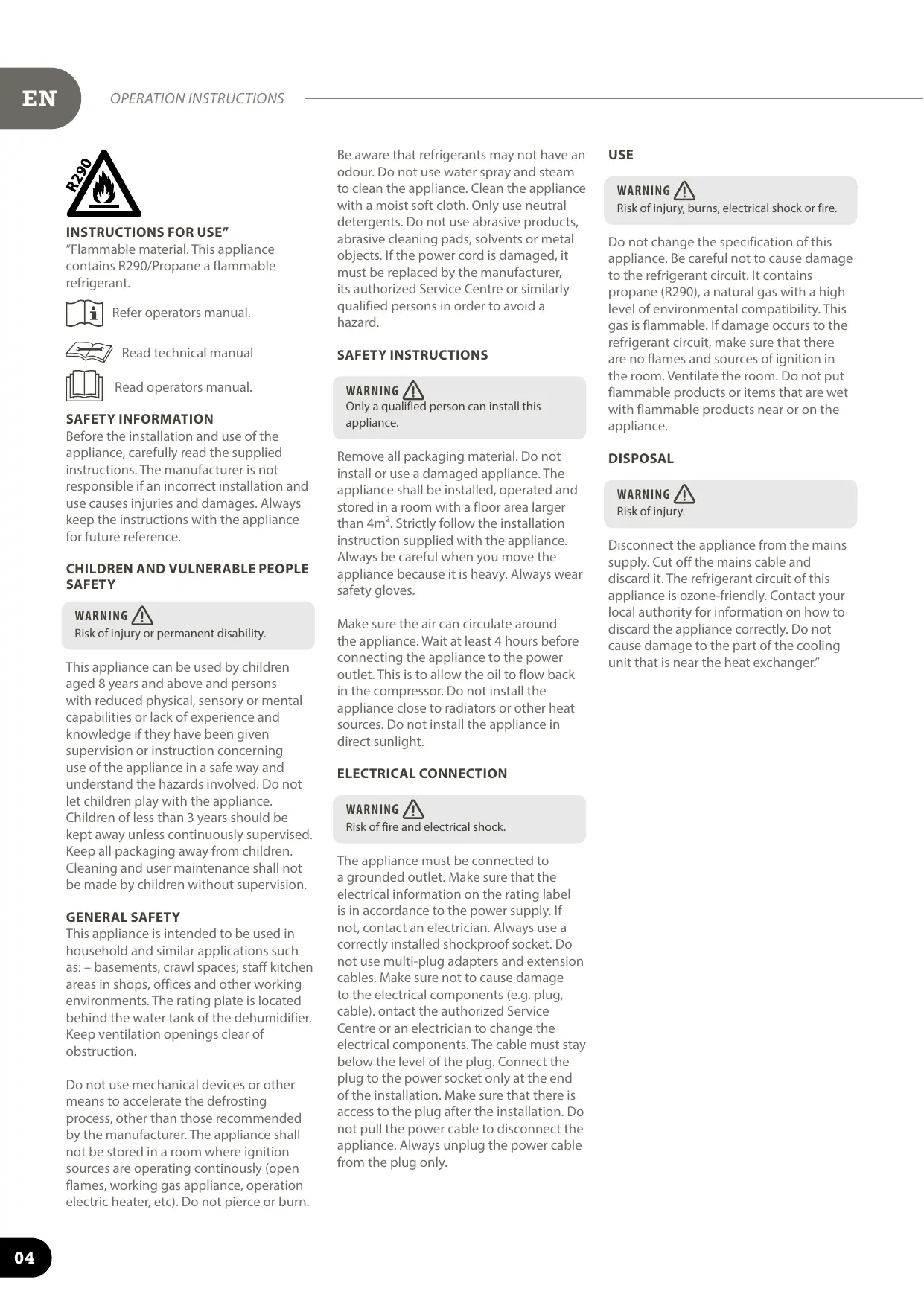 Ne pas utiliser de dispositifs mécaniques ou d'autres moyens pour accélérer le processus de dégivrage, autres que ceux recommandés par le fabricant. L'appareil ne doit pas être entreposé dans une pièce dans laquelle des sources inflammables fonctionnent en permanence (flammes nues, appareil à gaz, radiateur électrique, etc). Ne pas percer ni brûler. Tenir compte du fait que les réfrigérants n'ont pas forcément d'odeur. Ne pas utiliser de pulvérisation d'eau ni de vapeur pour nettoyer l'appareil. Nettoyer l'appareil à l'aide d'un chiffon doux humide. Utiliser uniquement des détergents neutres.