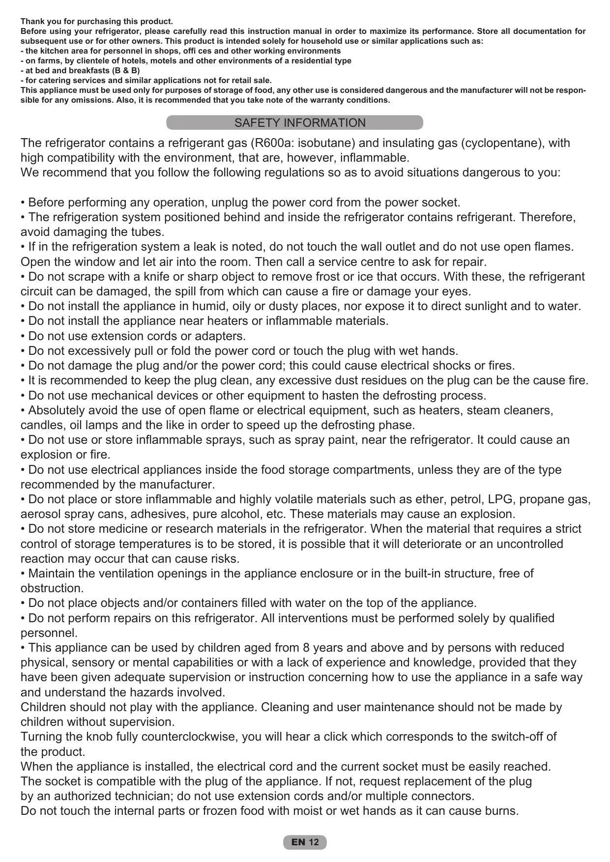 SAFETY INFORMATION The refrigerator contains a refrigerant gas (R600a: isobutane) and insulating gas (cyclopentane), with high compatibility with the environment, that are, however, inflammable. We recommend that you follow the following regulations so as to avoid situations dangerous to you: