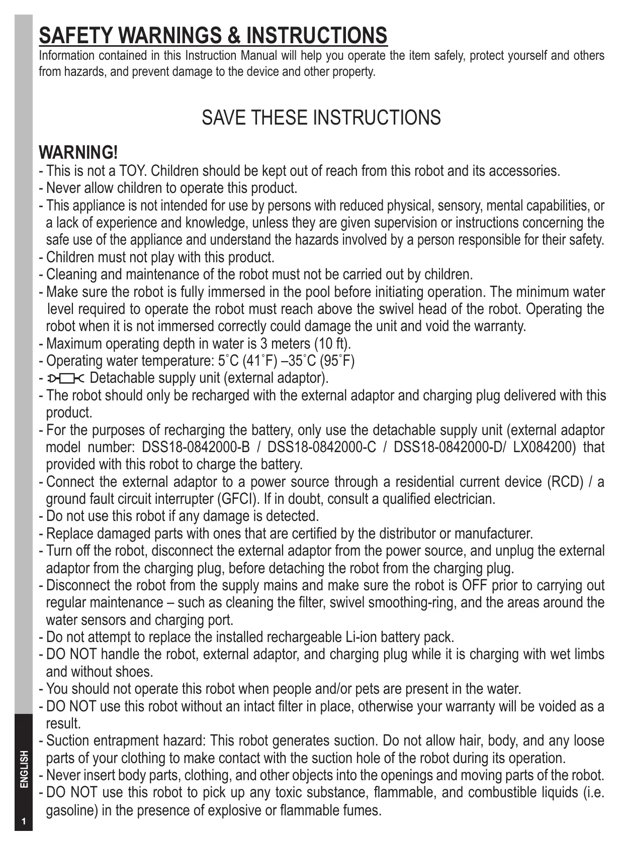 - Ce robot est conçu pour une utilisation sous l'eau uniquement; ce n'est pas un aspirateur tout usage. NE PAS essayer d'utiliser l'aspirateur électrique pour nettoyer autre chose que votre piscine.