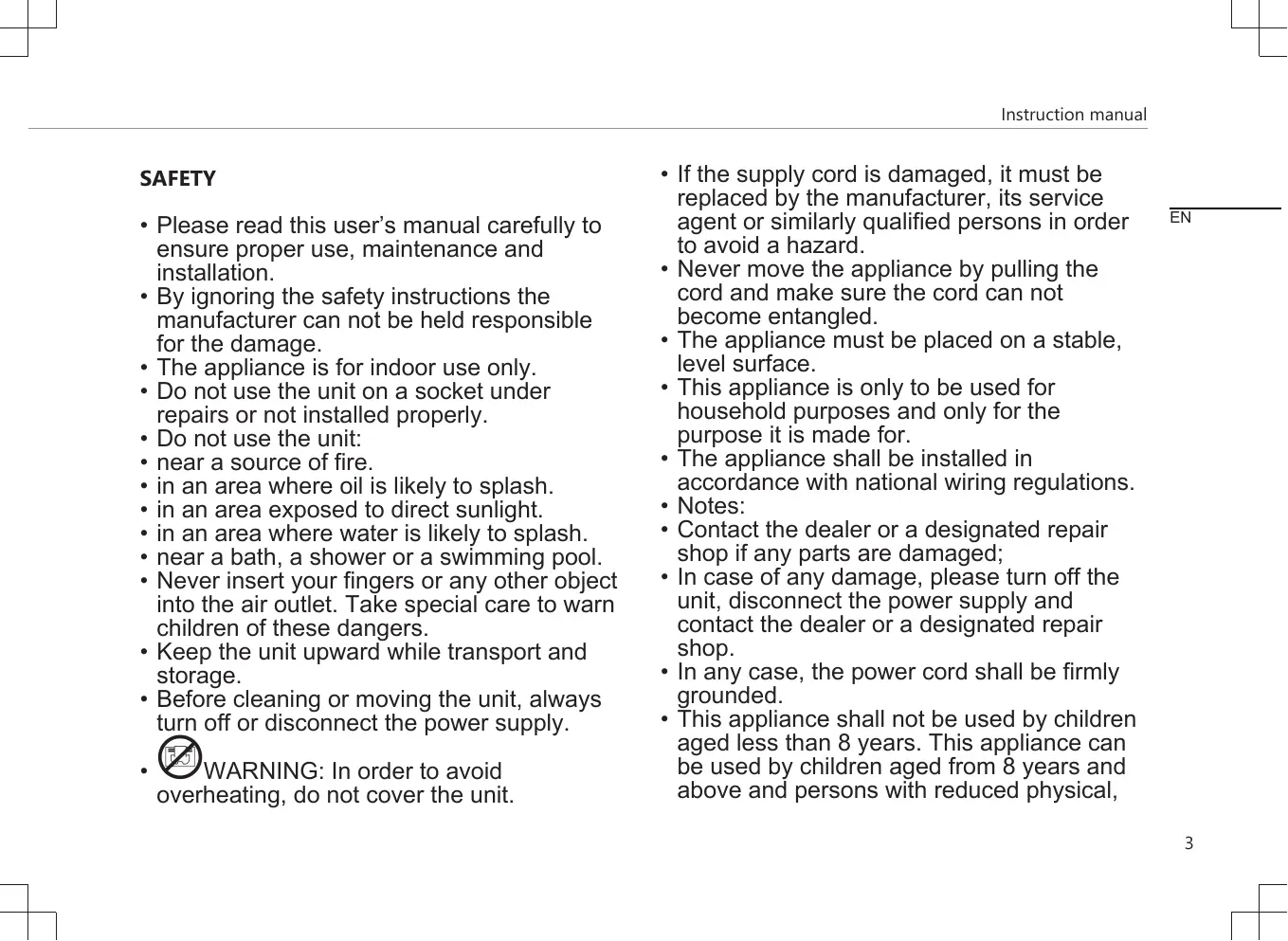 Ne déplacez jamais l'appareil en tirant sur le cordon et veillez à ce que ce dernier ne soit pas entortillé. L'appareil doit être posé sur une surface stable et nivelée. Cet appareil est uniquement destiné à des utilisations domestiques et seulement dans le but pour lequel il est fabriqué. L'appareil doit être installé conformément aux réglementations nationales en matière de câblage. Remarques : Si une pièce quelconque est endommagée, contactez le distributeur ou un atelier de réparation agréée ;