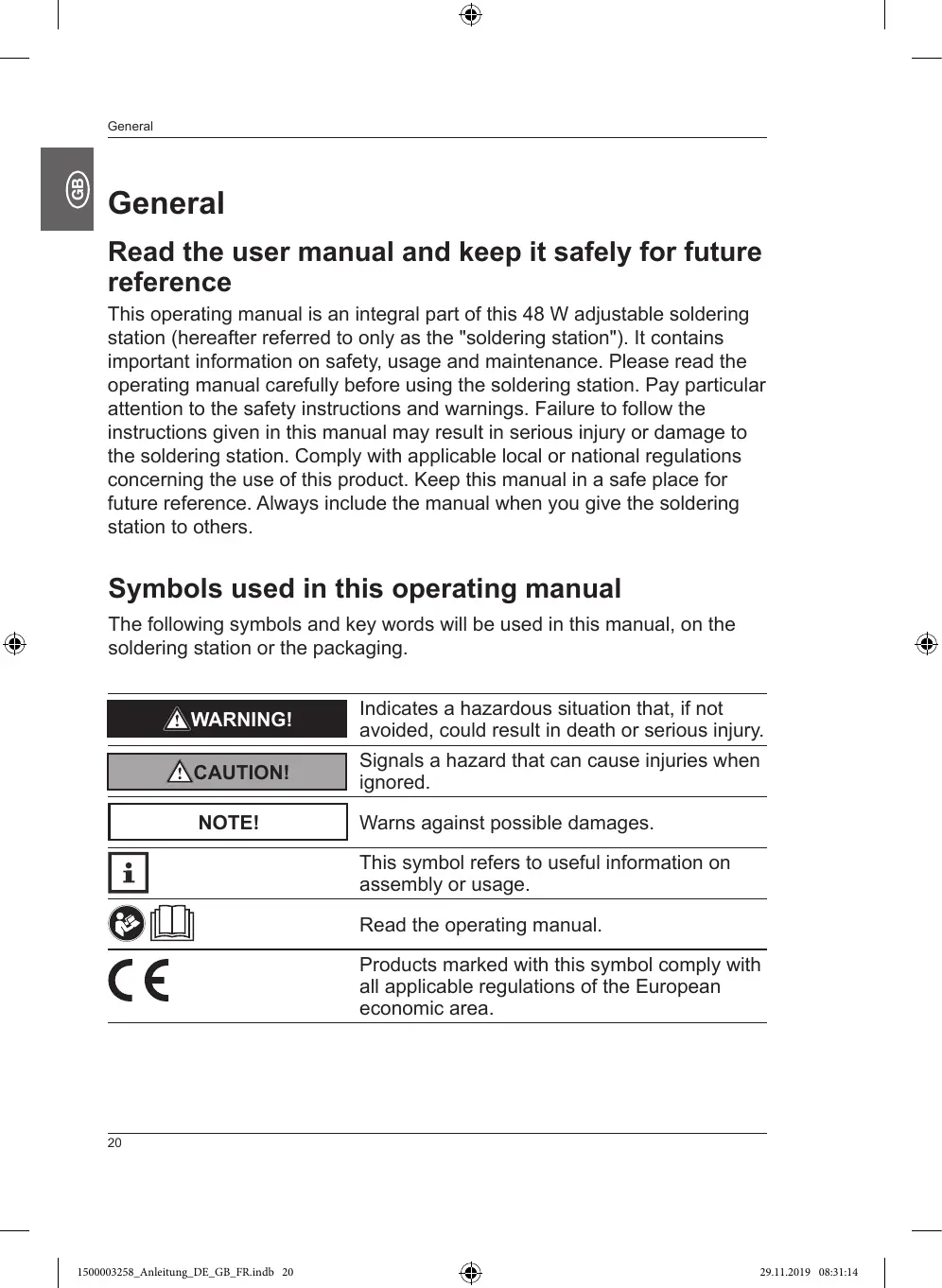 This operating manual is an integral part of this 48 W adjustable soldering station (hereafter referred to only as the "soldering station"). It contains important information on safety, usage and maintenance. Please read the operating manual carefully before using the soldering station. Pay particular attention to the safety instructions and warnings. Failure to follow the instructions given in this manual may result in serious injury or damage to the soldering station. Comply with applicable local or national regulations concerning the use of this product. Keep this manual in a safe place for future reference. Always include the manual when you give the soldering station to others.