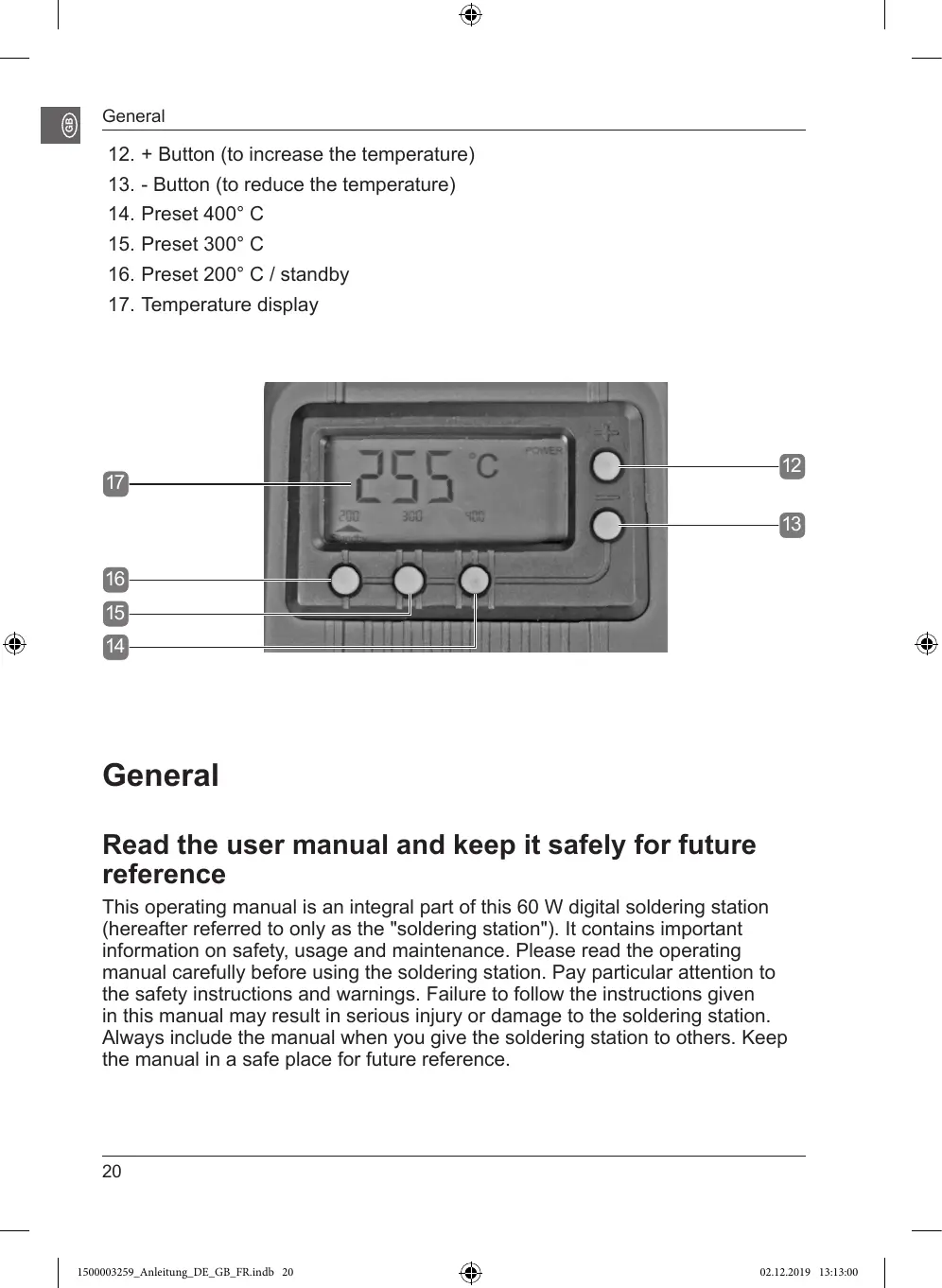 This operating manual is an integral part of this 60 W digital soldering station (hereafter referred to only as the "soldering station"). lt contains important information on safety, usage and maintenance. Please read the operating manual carefully before using the soldering station. Pay particular attention to the safety instructions and warnings. Failure to follow the instructions given