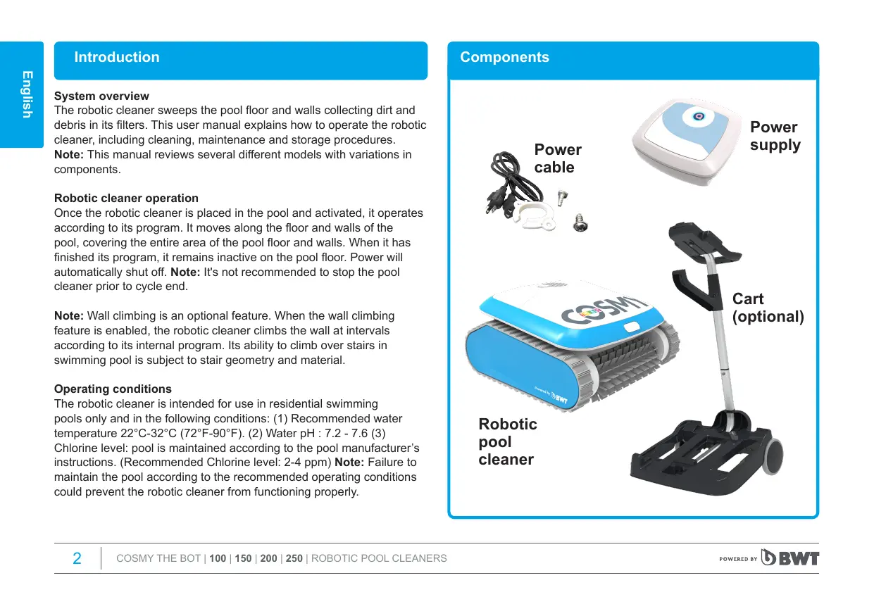 Download the instructions for your Robot de piscine in PDF format for free! Find your manual COSMY 100 / 150 / 200 / 250 - BWT and take your electronic device back in hand. On this page are published all the documents necessary for the use of your device. COSMY 100 / 150 / 200 / 250 by BWT.