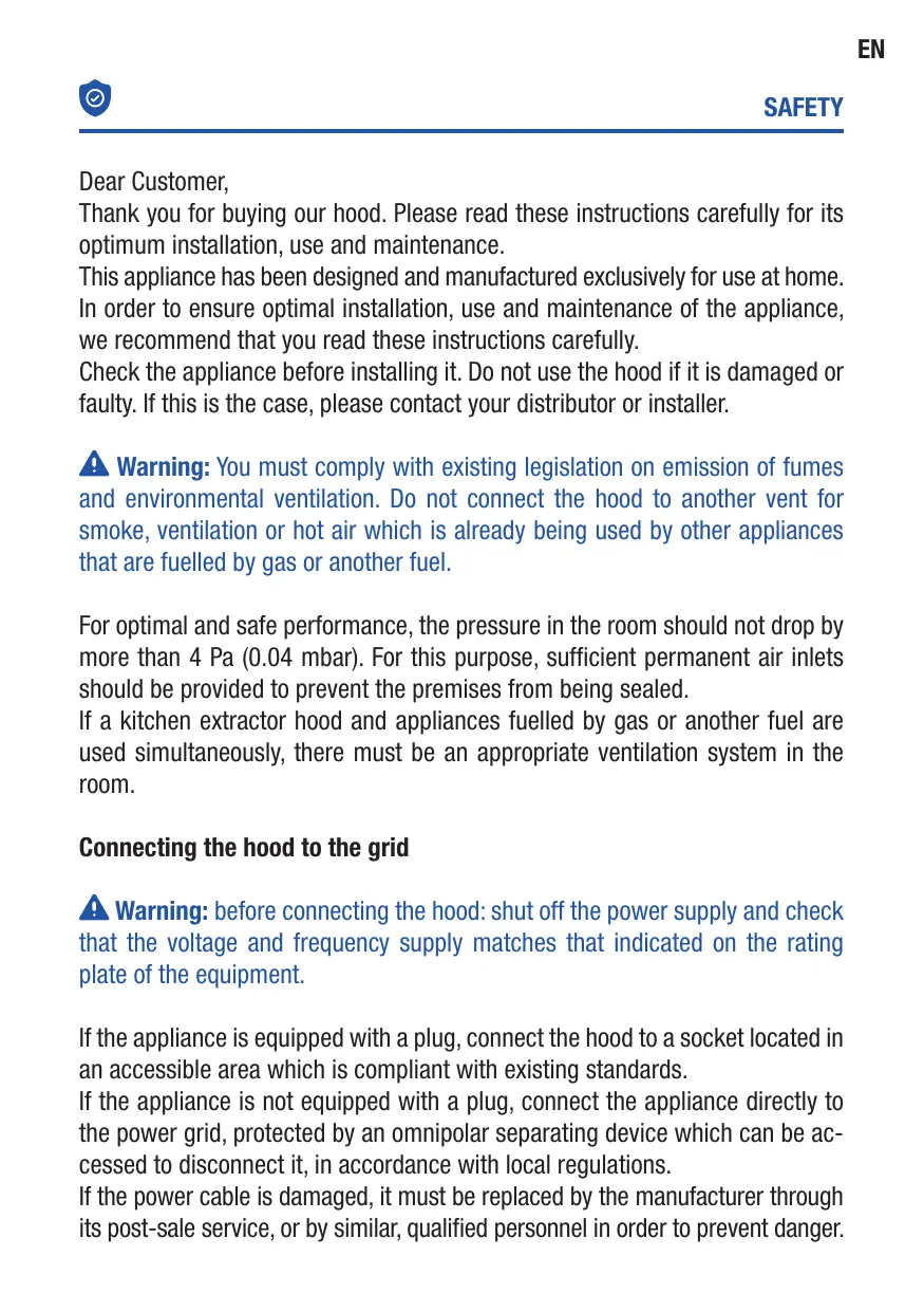 Thank you for buying our hood. Please read these instructions carefully for its optimum installation, use and maintenance.