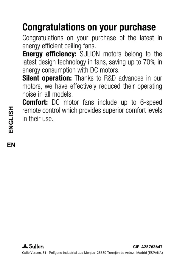 Energy efficiency: SULION motors belong to the latest design technology in fans, saving up to 70% in energy consumption with DC motors.