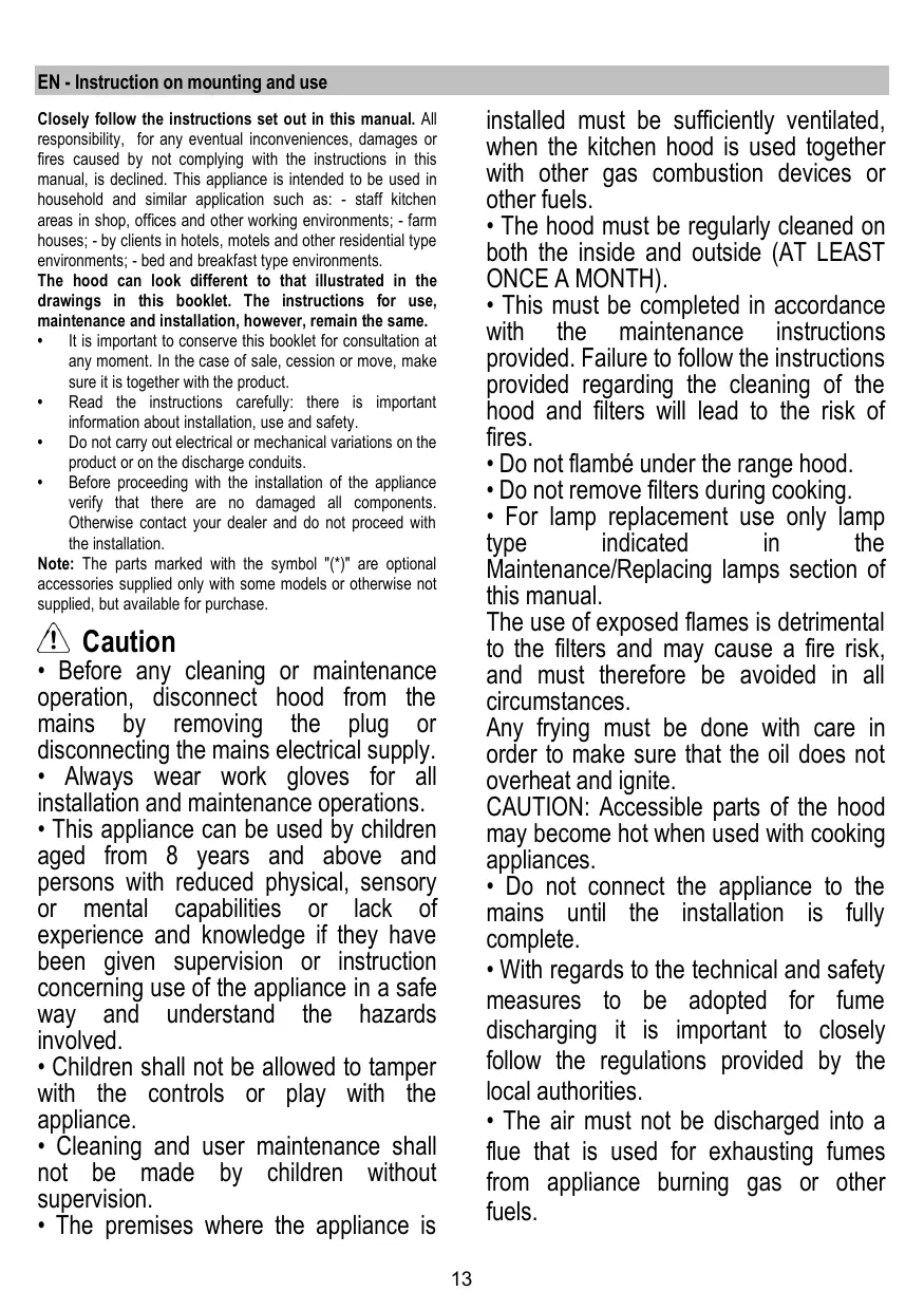 + La hotte ne doit JAMAIS être utilisée comme une surface d'appui, sauf indication expresse.