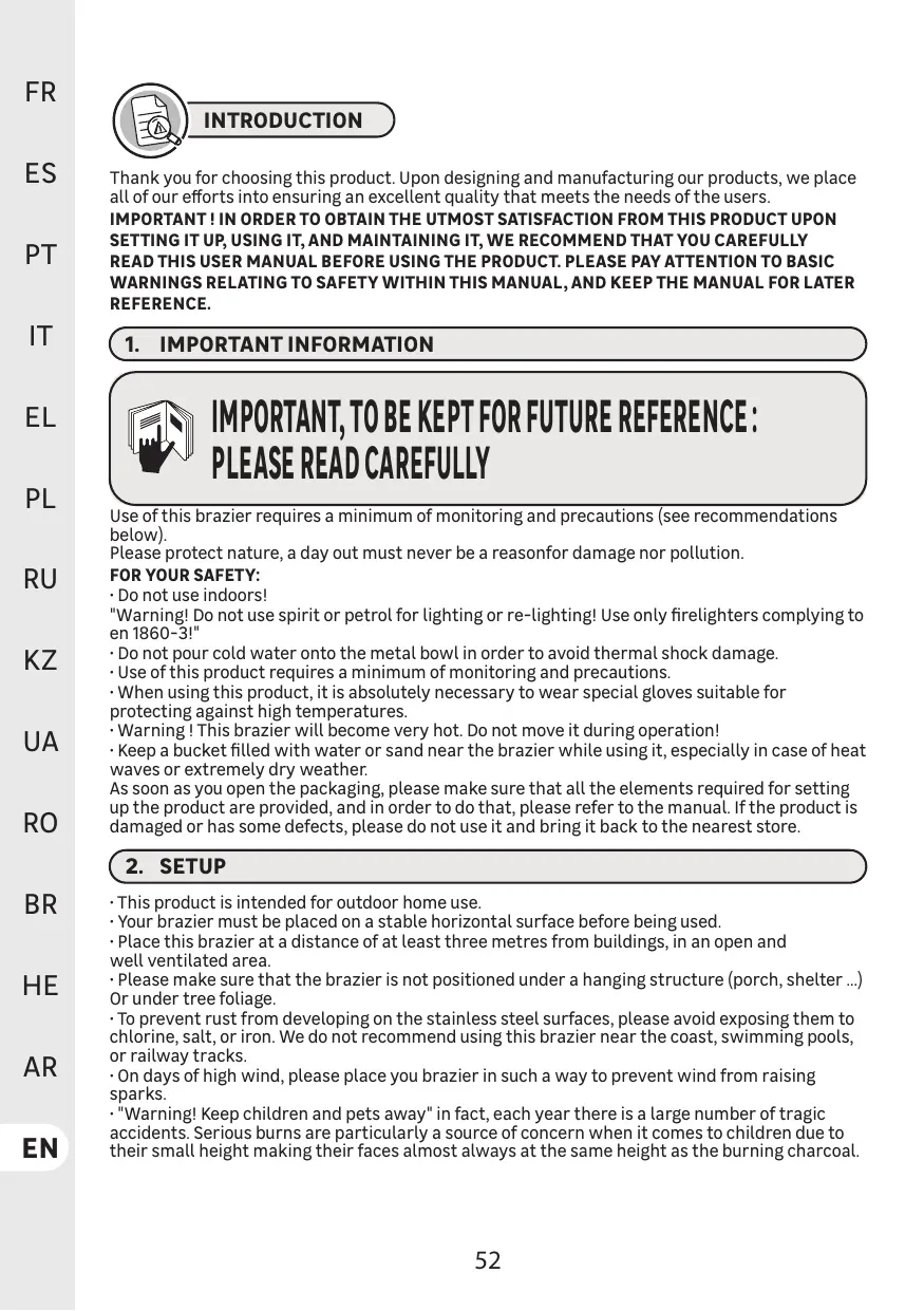 - ATTENTION! Ce brasero n'est pas un barbecue, il est fortement interdit de l'utiliser comme moyen de cuisson.