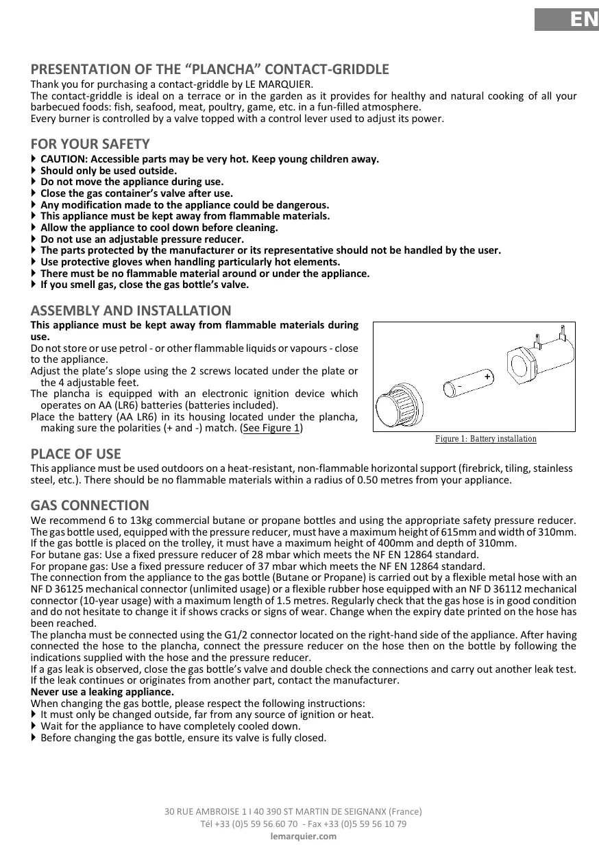 Mettre la pile (AA LR6) dans son logement qui se trouve sous la plancha en respectant le sens de polarité + et -. (Voir figure 1)