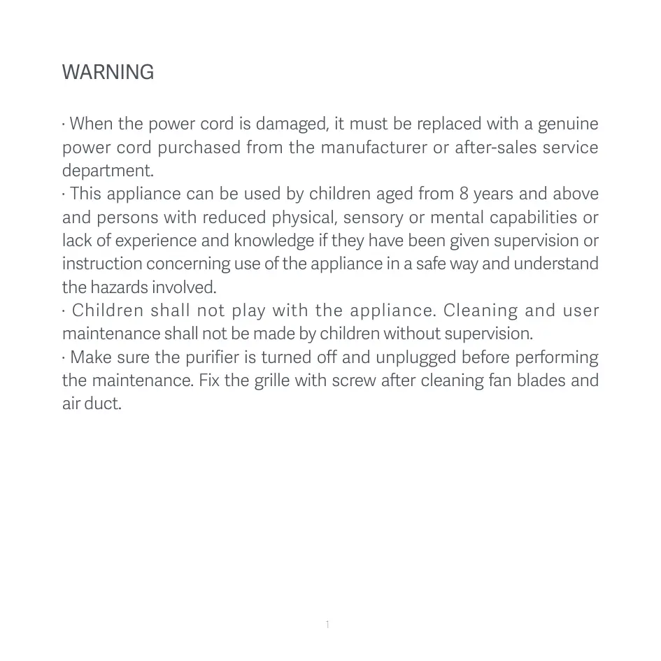 - Make sure the purifier is turned off and unplugged before performing the maintenance. Fix the grille with screw after cleaning fan blades and air duct.