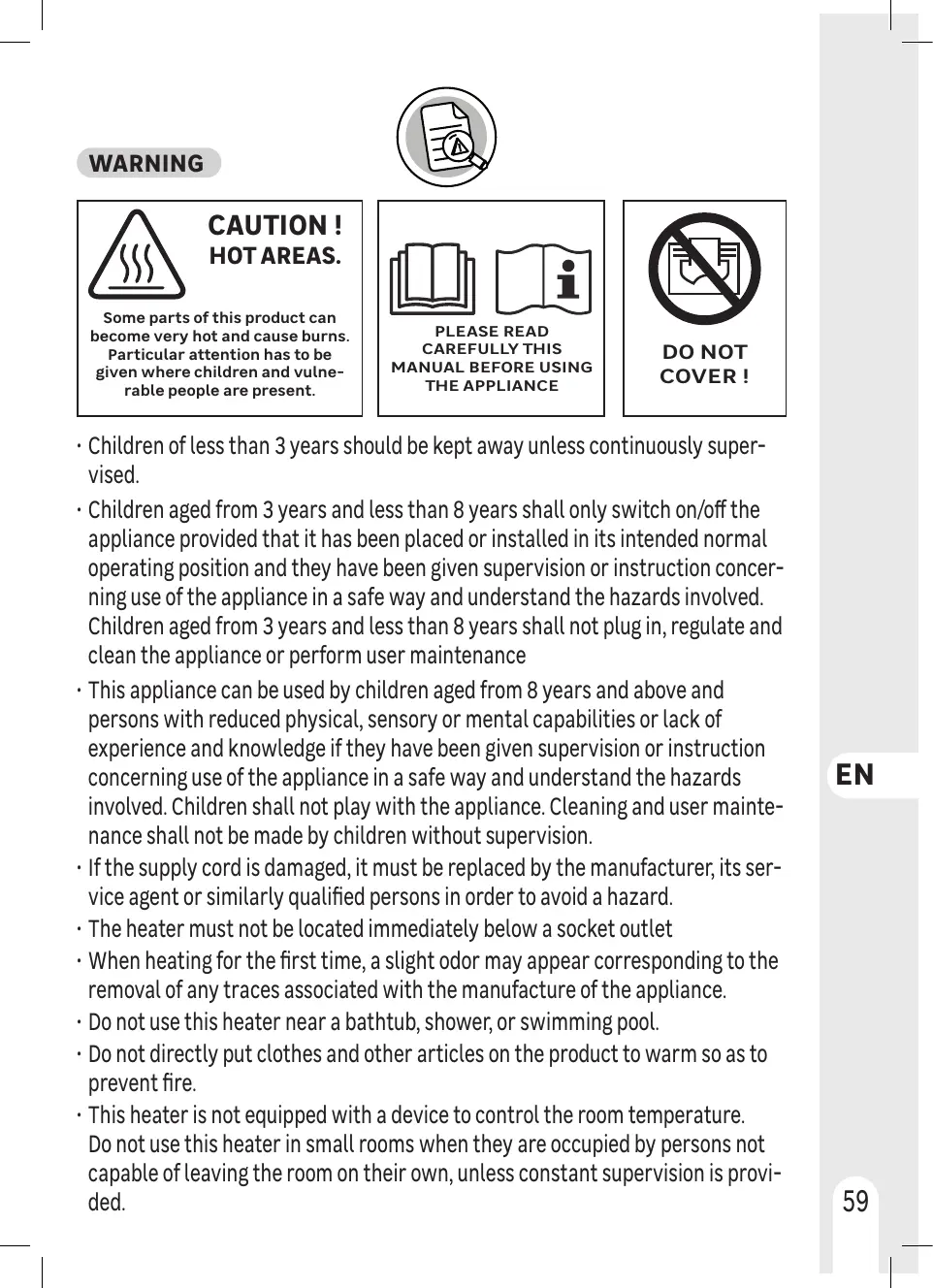 + Ne pas utiliser cet appareil de chauffage à proximité d'une baignoire, d'une douche, ou d'une piscine.