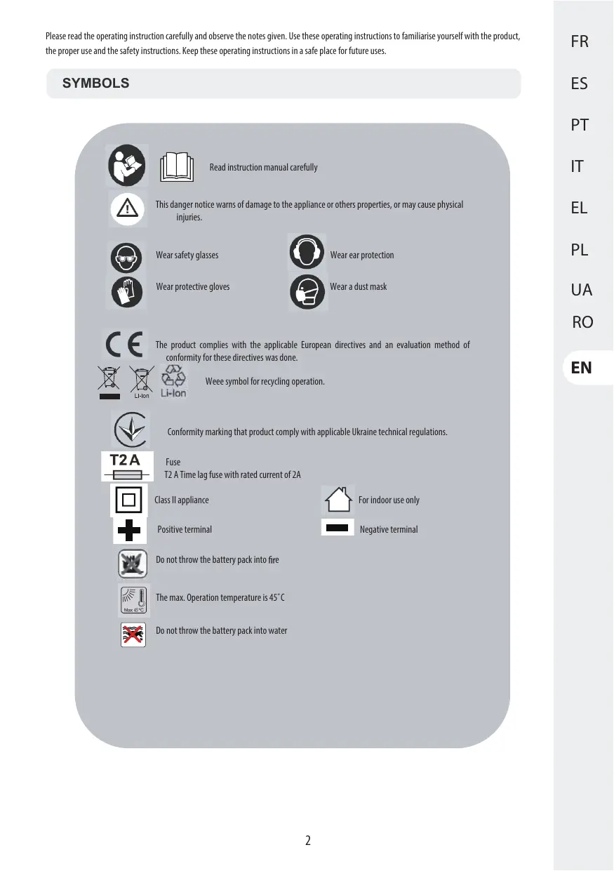 PROTECTION DE L'ENVIRONNEMENT Les produit électriques usagés ne doivent pas être jetés avec les ordures ménagères. Conformément à a directive européenne relative aux batteries, les batteries usagées ou défectueuses doivent être collectées séparément et mises au rebut d'une manière écologique. Vellez à ce