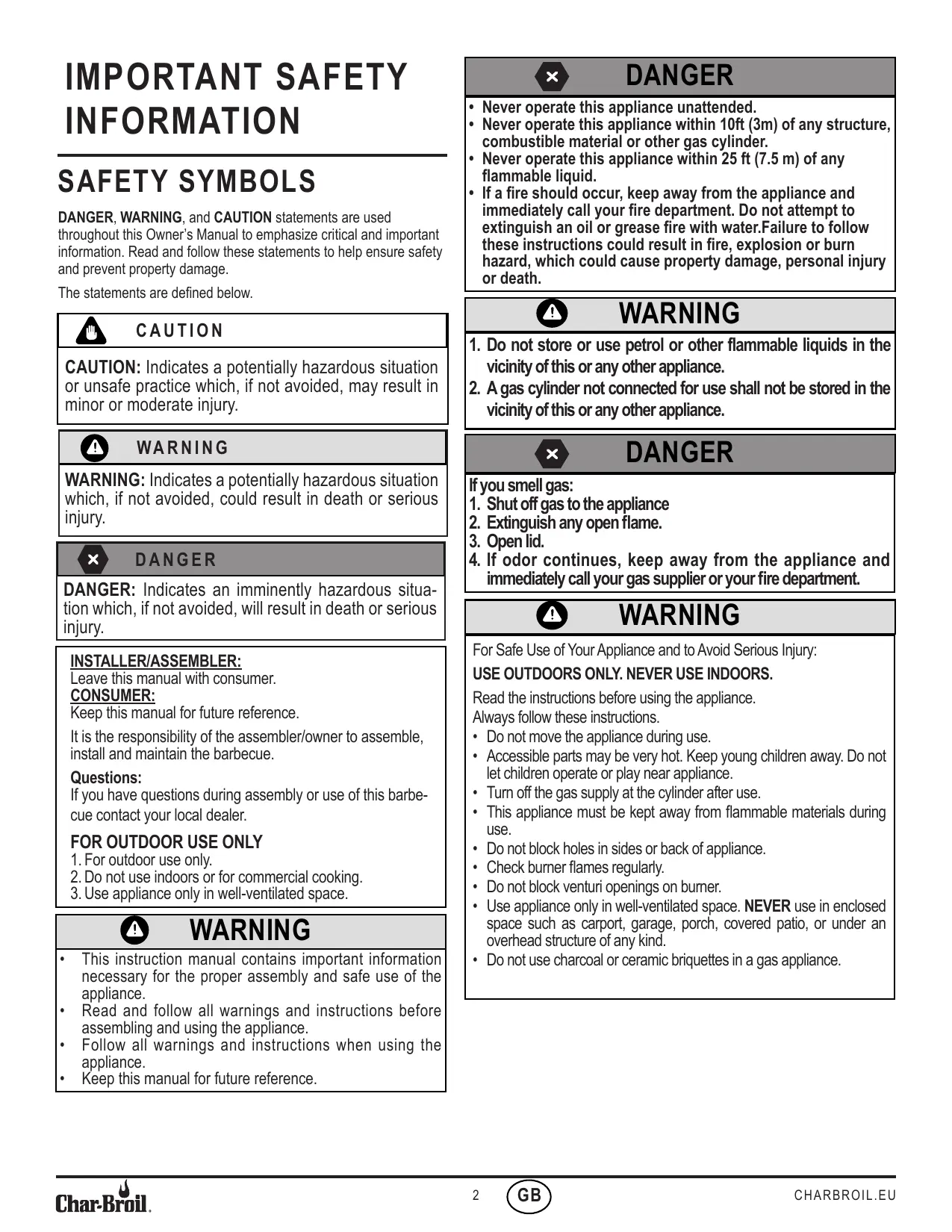Download the instructions for your Barbecue in PDF format for free! Find your manual CRUISE - 468921224 - 468922224 - CHAR BROIL and take your electronic device back in hand. On this page are published all the documents necessary for the use of your device. CRUISE - 468921224 - 468922224 by CHAR BROIL.