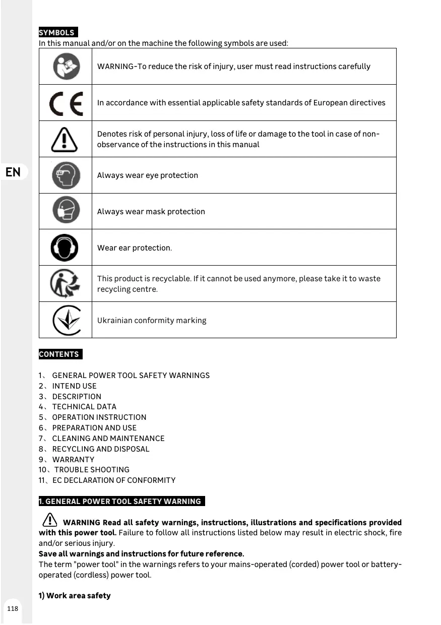 2. UTILISATION PRÉVUE Cette machine sert à polir Les outils de coupe, les fers à repasser, Les burins, les gouges, les outils de tournage, Les forets etc. Ce produit n'est pas destiné à un usage commercial et ne peut pas être utilisé avec des brosses circulaires métalliques.