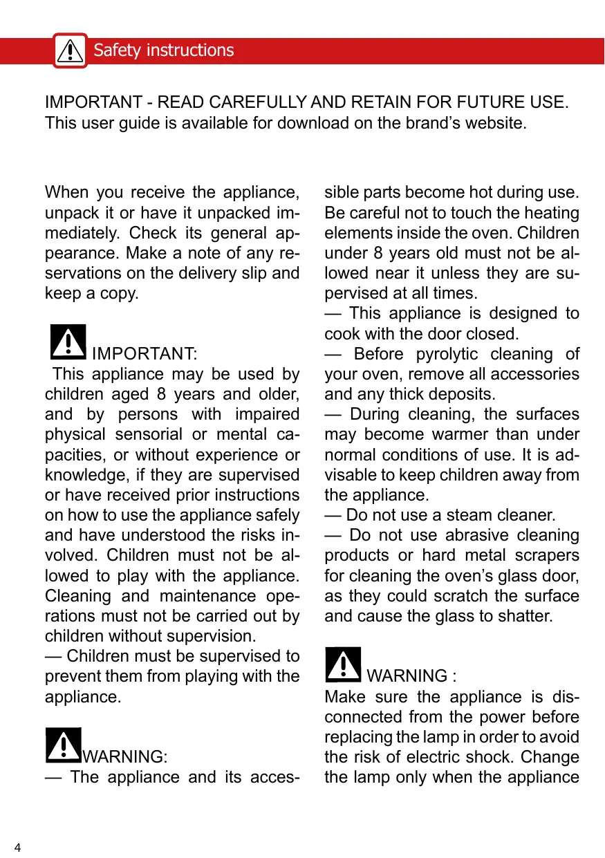 + L'appareil et ses parties acces- sibles deviennent chaudes au cours de l’utilisation. Faire atten- tion à ne pas toucher les éléments chauffants situés à l'intérieur du four. Les enfants de moins de 8 ans doivent être tenus à l'écart à moins qu'ils ne soient surveillés en permanence.