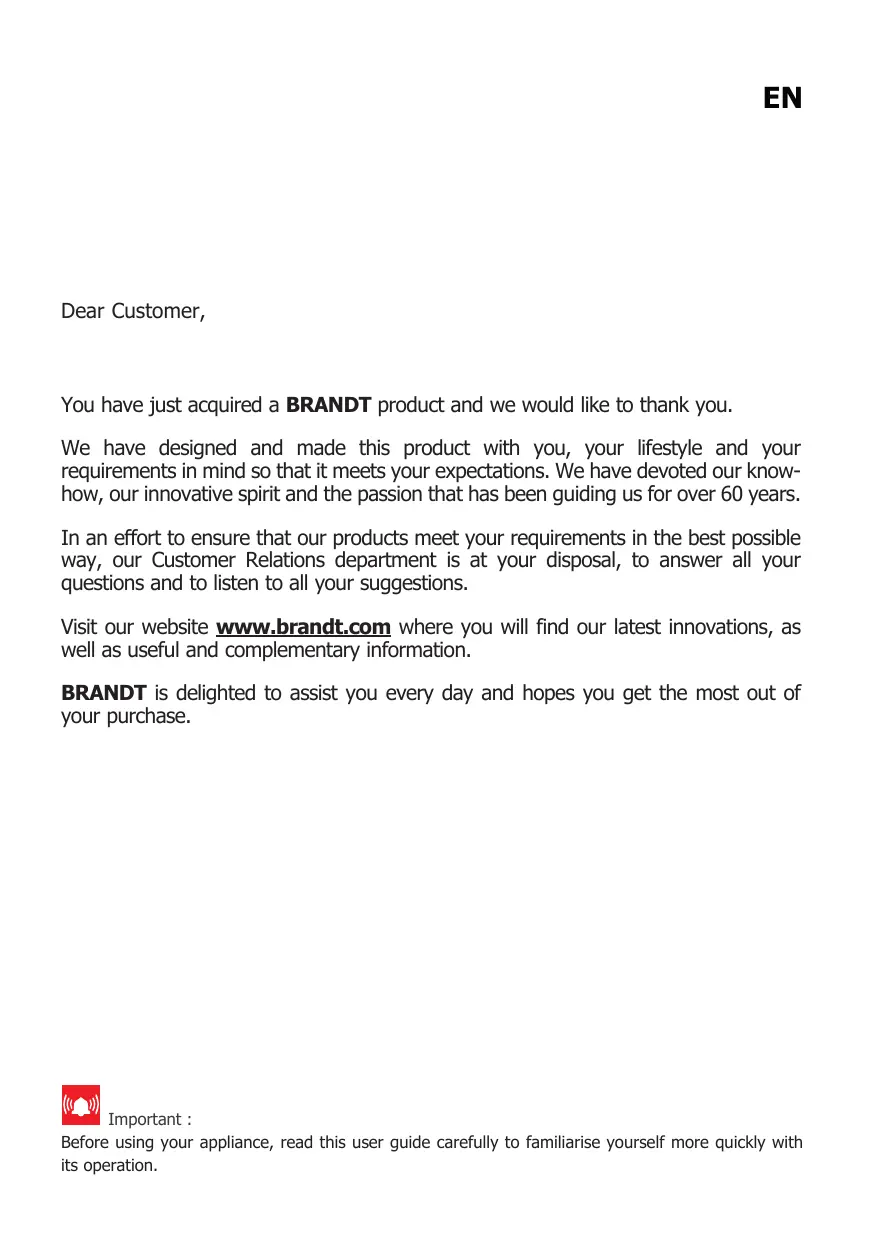 You have just acquired a BRANDT product and we would like to thank you.