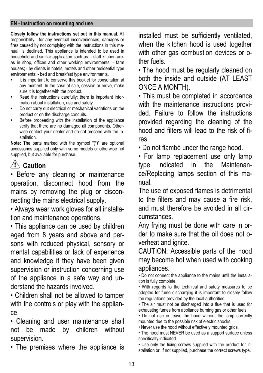 + Ne pas utiliser ou laisser la hotte sans les lampes correcte- ment montées, car un éventuel risque de choc électrique est possible.
