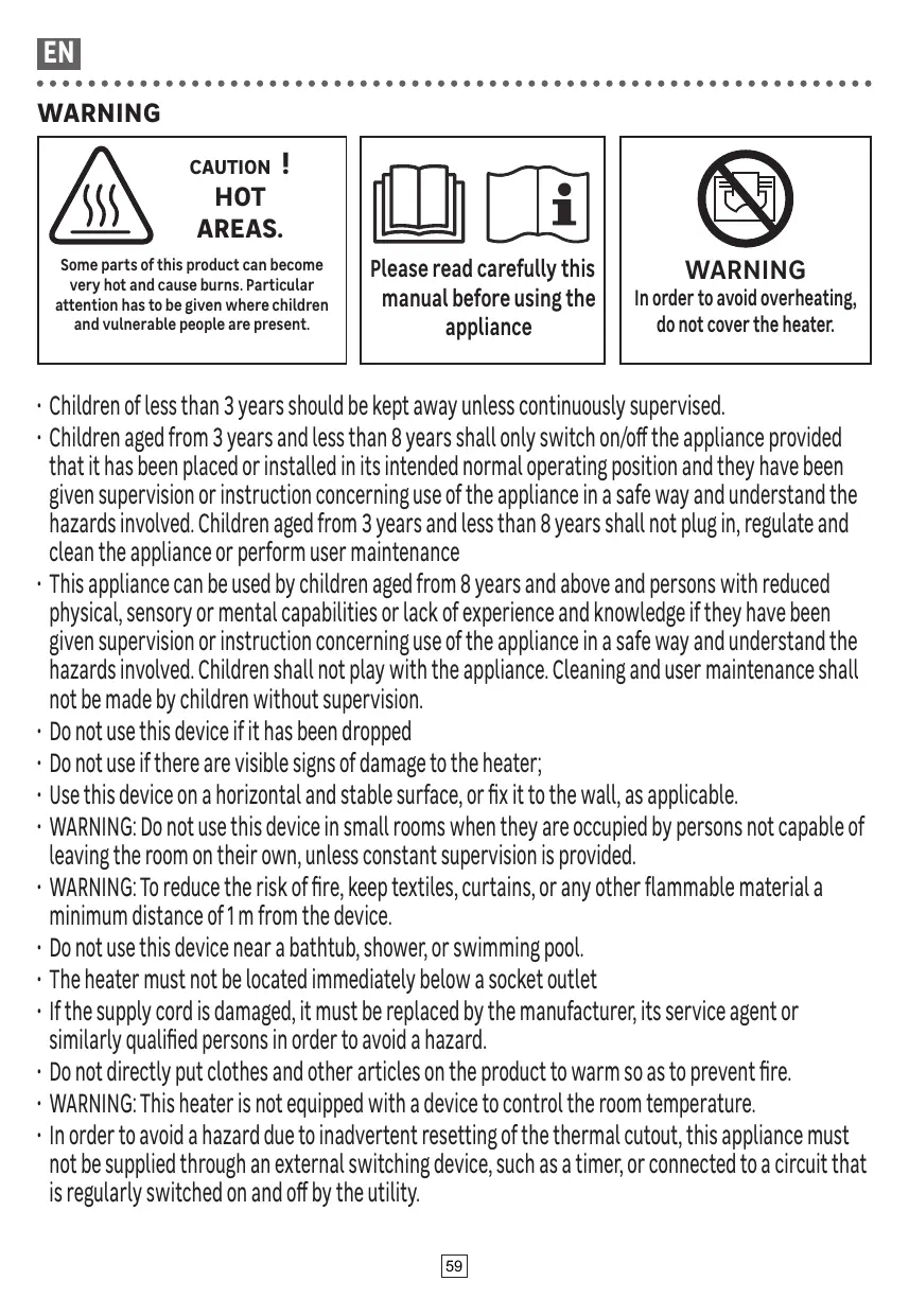 + AVERTISSEMENT: Ce radiateur n'est pas équipé d'un dispositif de contrôle de la température ambiante.