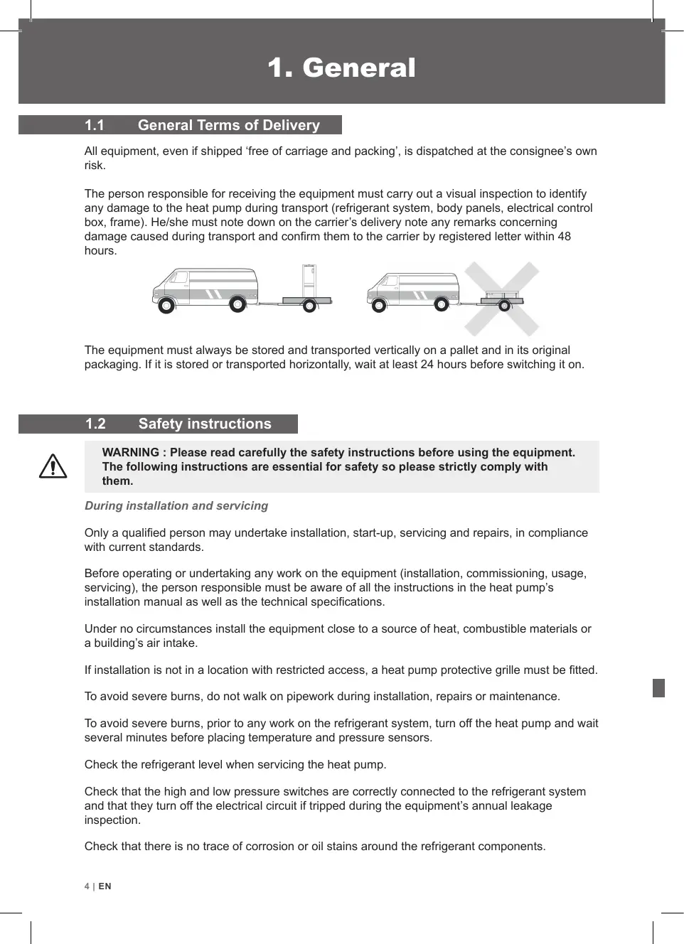 The person responsible for receiving the equipment must carry out a visual inspection to identify any damage to the heat pump during transport (refrigerant system, body panels, electrical control box, frame). He/she must note down on the carrier's delivery note any remarks conceming damage caused during transport and confirm them to the carrier by registered letter within 48 hours.