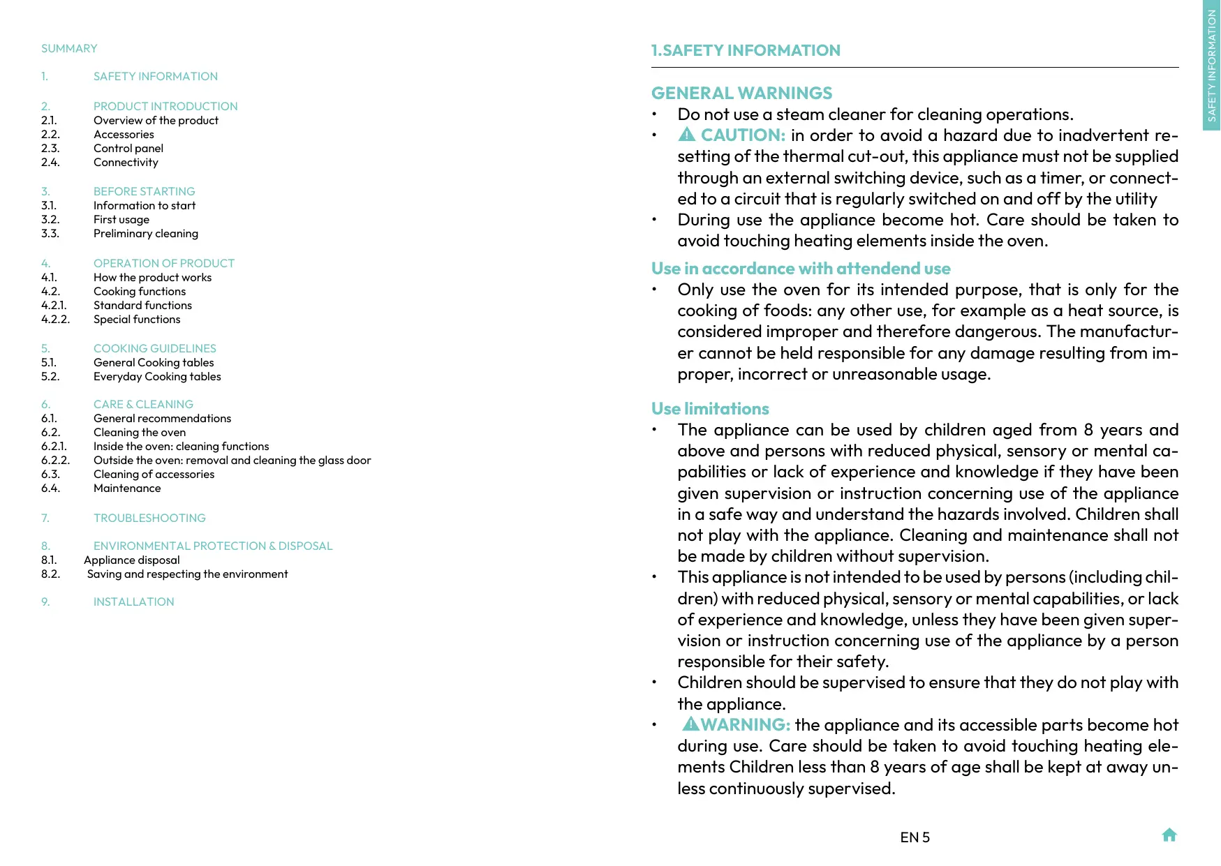 1.SAFETY INFORMATION GENERAL WARNINGS + Do not use a steam cleaner for cleaning operations. + À CAUTION: in order to avoid a hazard due to inadvertent re- setting of the thermal cut-out, this appliance must not be supplied through an external switching device, such as a timer, or connect- ed to a circuit that is regularly switched on and off by the utility + During use the appliance become hot. Care should be taken to avoid touching heating elements inside the oven. Use in accordance with attendend use + Only use the oven for its intended purpose, that is only for the cooking of foods: any other use, for example as a heat source, is considered improper and therefore dangerous. The manufactur- er cannot be held responsible for any damage resulting from im- proper, incorrect or unreasonable usage. Use limitations + The appliance can be used by children aged from 8 years and above and persons with reduced physical, sensory or mental ca- pabilities or lack of experience and knowledge if they have been given supervision or instruction concerning use of the appliance in a safe way and understand the hazards involved. Children shall not play with the appliance. Cleaning and maintenance shall not be made by children without supervision. + This applianceis not intended to be used by persons (including chil- dren) with reduced physical, sensory or mental capabilities, or lack of experience and knowledge, unless they have been given super- vision or instruction concerning use of the appliance by a person responsible for their safety. + Children should be supervised to ensure that they do not play with the appliance. + À WARNING: the appliance andits accessible parts become hot during use. Care should be taken to avoid touching heating ele- ments Children less than 8 years of age shall be kept at away un- less continuously supervised. EN5 ñ