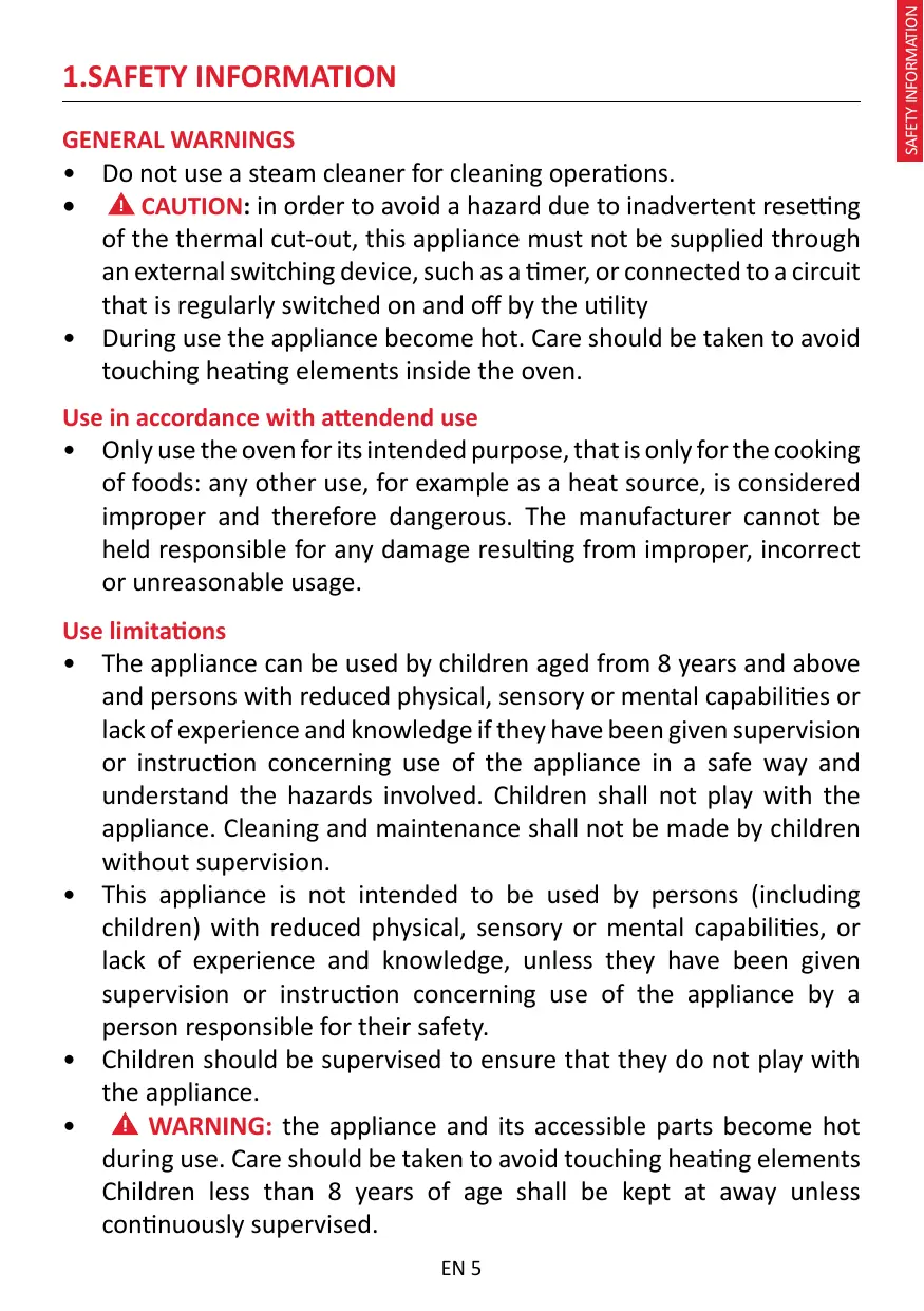 Utiliser le four uniquement aux fins prévues, à savoir pour cuire des aliments. Toute autre utilisation, par exemple comme source de chaleur, est considérée comme impropre et par conséquent dangereuse. Le fabricant ne peut être tenu pour responsable de tout dégât provoqué par un usage inadapté, incorrect ou déraisonnable.
