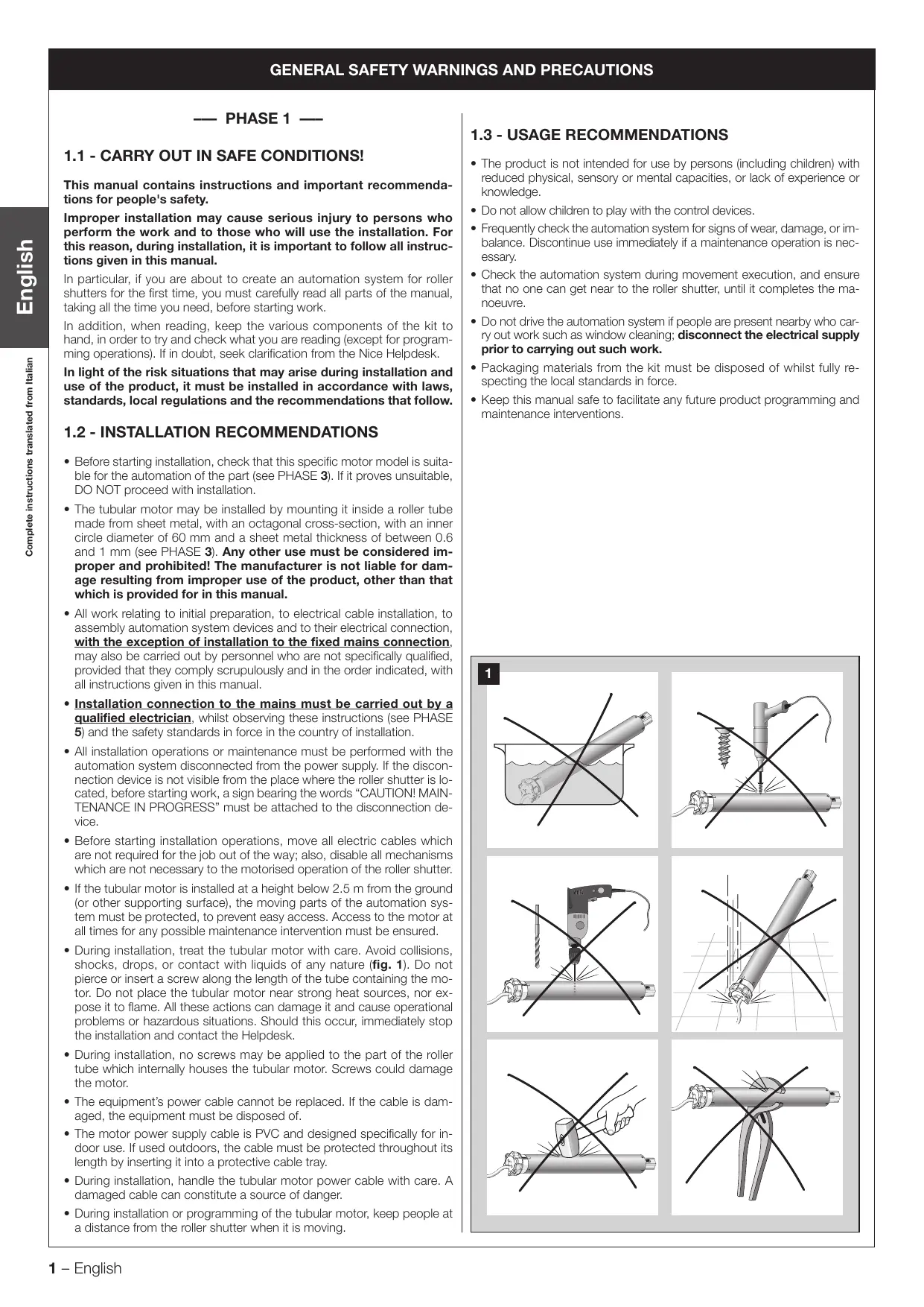 évitant les écrasements, les chocs, les chutes ou le contact avec des liquides de n'importe quelle nature (fig. 1). Ne pas percer ni appliquer de vis tout le long du tube qui contient le moteur. Ne pas mettre le mo- teur tubulaire à proximité de fortes sources de chaleur ni l'exposer à des flammes. Toutes ces actions peuvent l'endommager et causer des pro- blèmes de fonctionnement où des situations de danger. Si cela se pro- duit, suspendre immédiatement l'installation et s'adresser au Service d'assistance technique.