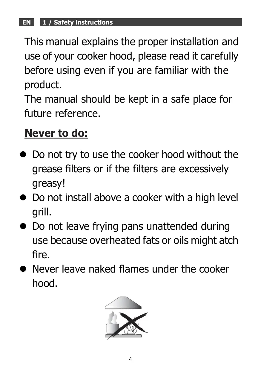 e Ne laissez jamais une flamme nue sous la hotte.