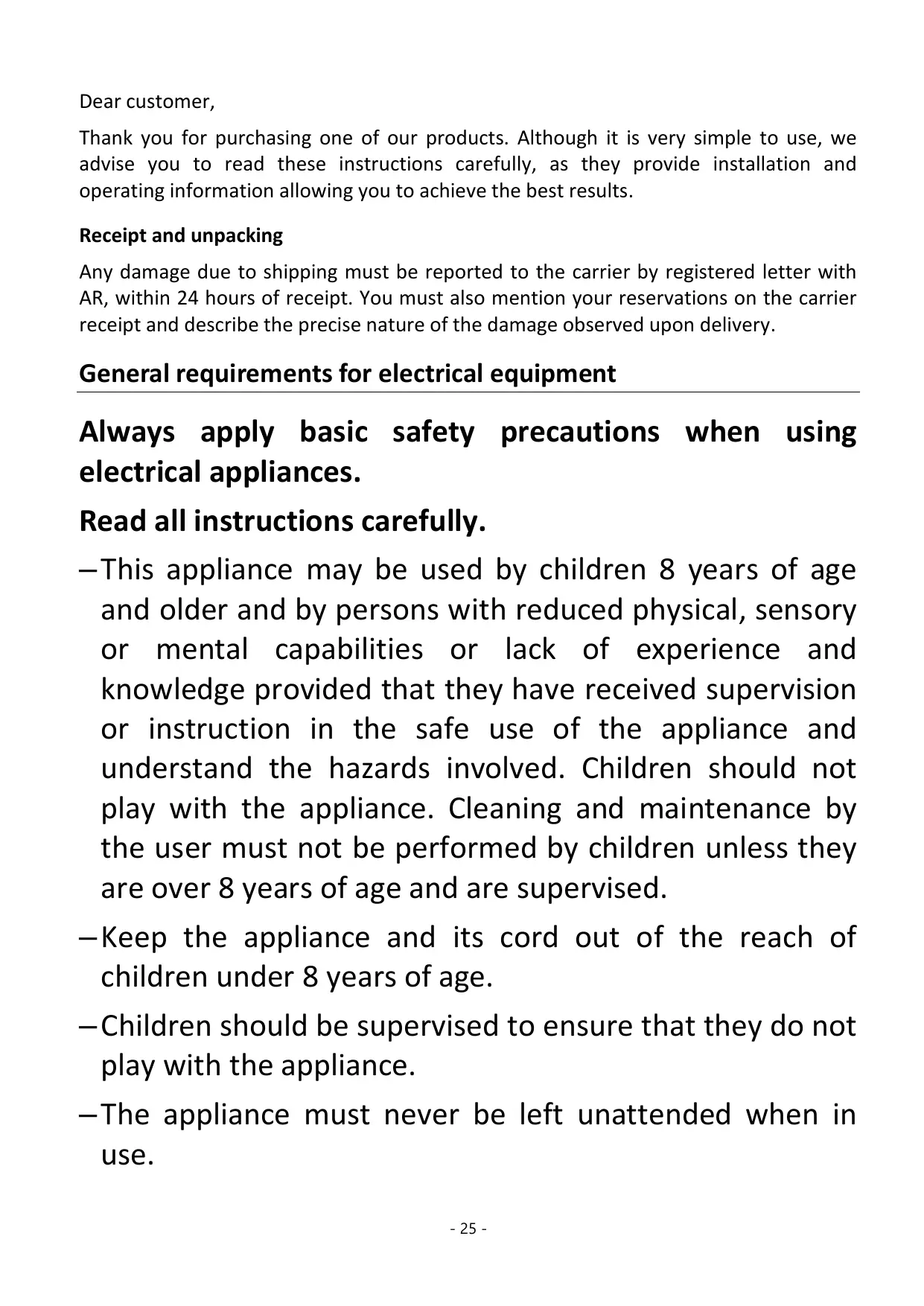 —This appliance may be used by children 8 years of age and older and by persons with reduced physical, sensory or mental capabilities or lack of experience and knowledge provided that they have received supervision or instruction in the safe use of the appliance and understand the hazards involved. Children should not play with the appliance. Cleaning and maintenance by the user must not be performed by children unless they are over 8 years of age and are supervised.