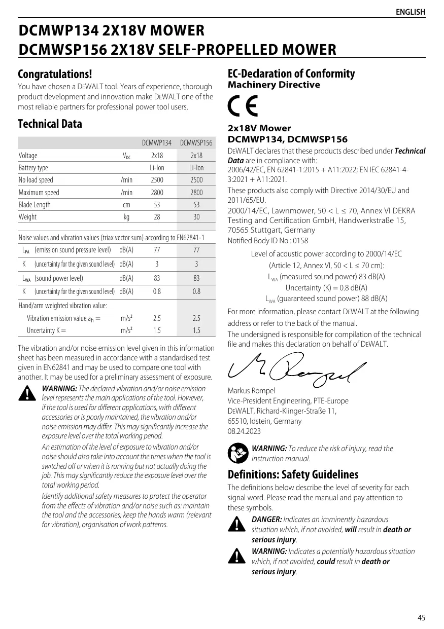 DEWALT certifie que ces produits décrits dans la section Caractéristiques techniques sont en conformité avec 2006/42/CE, EN 62841-1:2015 + A11:2022; EN IEC 62841-4- 32021 + A11:2021 Ces produits sant également conformes aux directives 2014/30/ UE et 2011/65/UE. 2000/14/CE, Tondeuse à gazon, 50 < L < 70, Annexe VI DEKRA Testing and Certification GmbH, HandwerkstraBe 15, 70565 Stuttgart, Allemagne N° d'identification de l'organisme mandaté : 0158 Niveau de puissance sonore selon 2000/14/CE (Article 12, DANGER : indique une situation dangereuse imminente qui, si elle n'est pas évitée, entraînera des blessures graves ou mortelles. AVERTISSEMENT : indique une situation dangereuse potentielle qui, sielle n'est pas évitée, pourrait entraîner des blessures graves ou mortelles.
